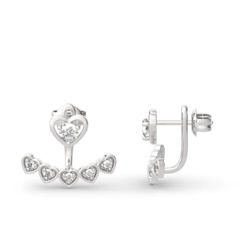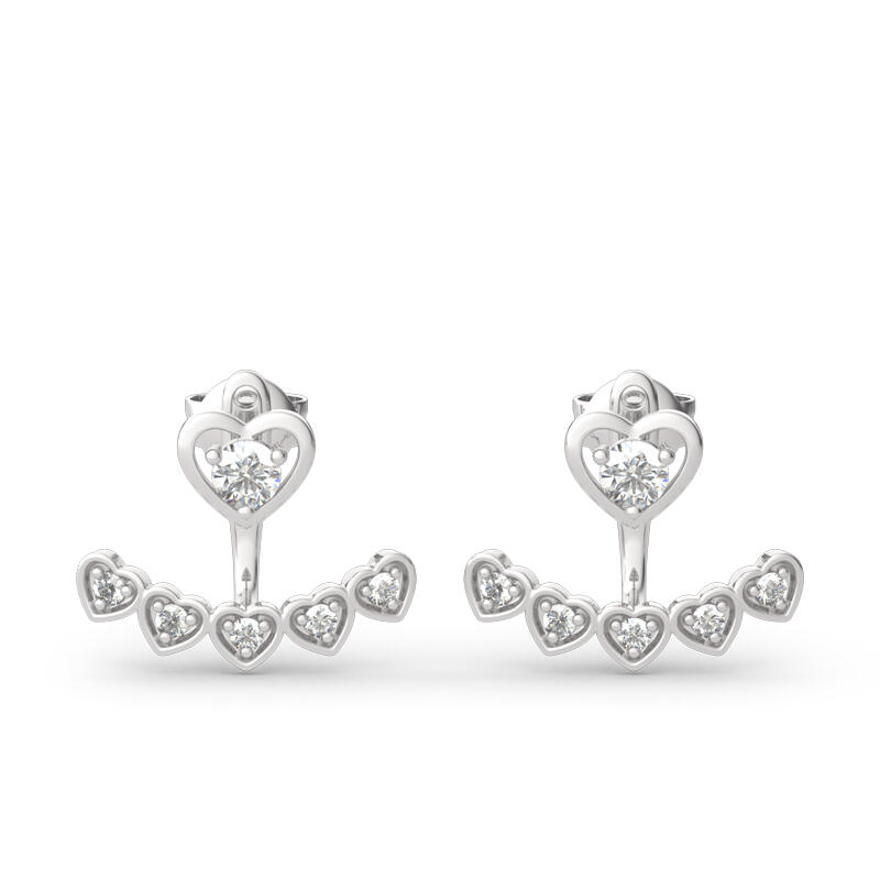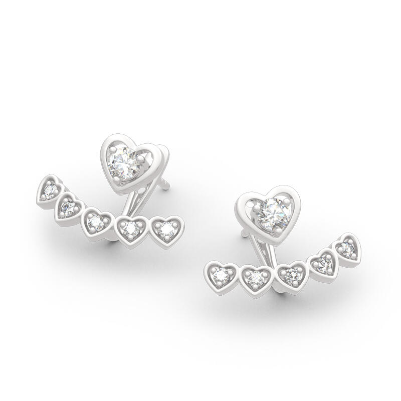 Hearts decorated with shimmering round stones are showcased in these sweet jacket earrings for her. Beautifully crafted in sterling silver, each dainty open heart stud earrings shimmers with a round white stones center. Polished to a bright shine, these dainty earrings secure comfortably with backs. Charm the one you adore with these beautiful heart jacket earrings.