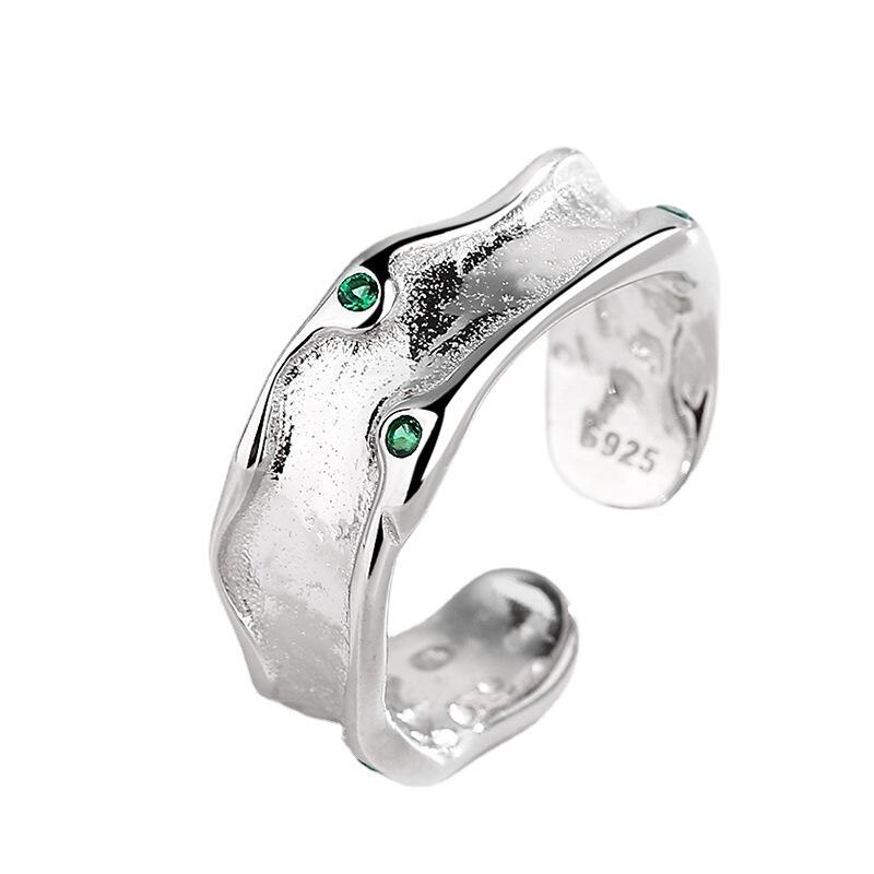 Simple and modern in their style, this piece makes a unique gift for loved one or yourself. Crafted in sterling silver, this ring features an irregular shank design adorned with two green round stones.