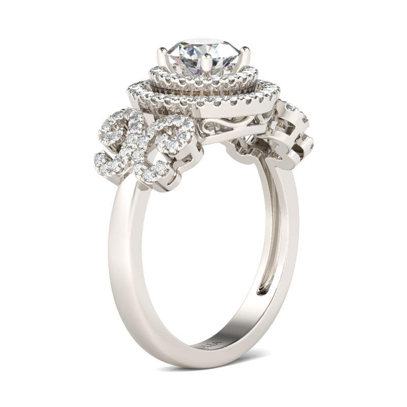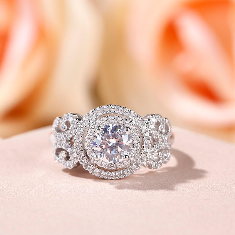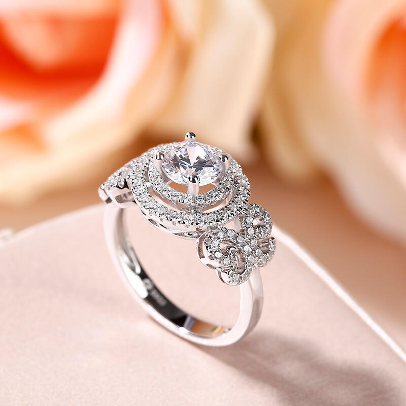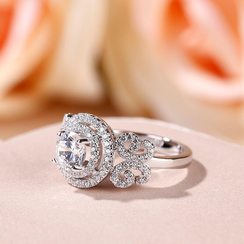 Elegant and nature-inspired, this stunning bridal set reflects her sophisticated style. The engagement ring features a round-cut center stone wrapped in double halo frame.The shank showcases two butterfly-shaped design adorned with sparking stones, which makes the ring an exquisite piece. This engagement ring is a symbol of faithfulness and everlasting love.