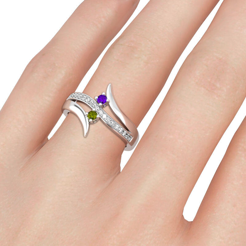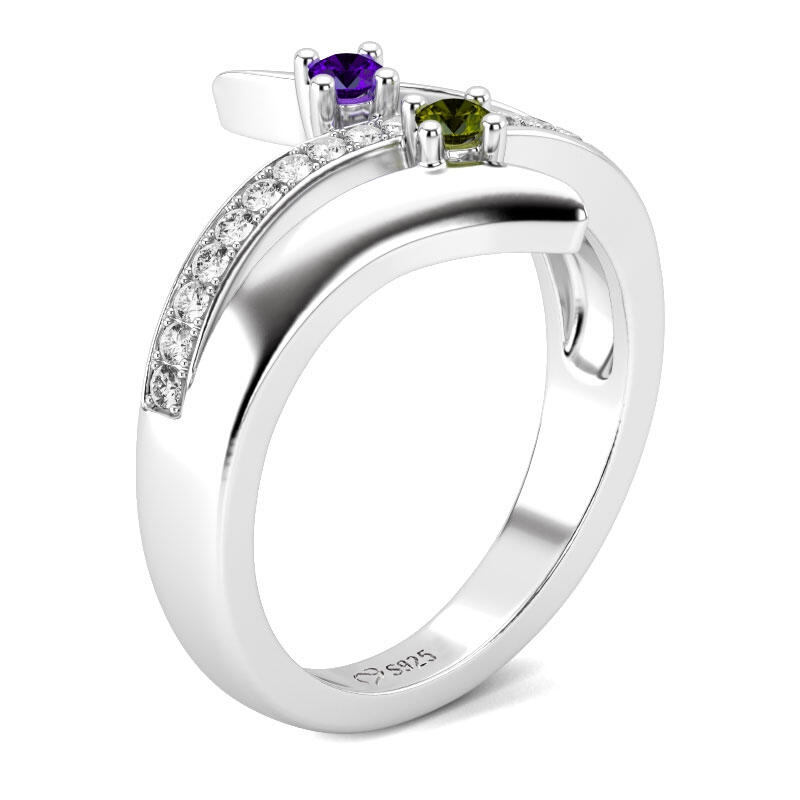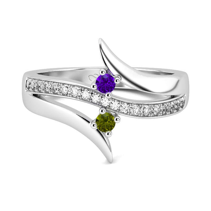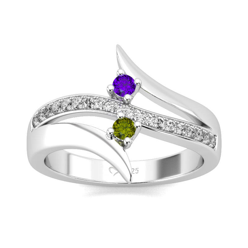 Dazzle and delight her with this two-stone ring. Crafted in sterling silver, the bold design is centered with two round-cut center stone - on the diagonal along a shimmering paved shank. Two ribbons of polished sterling silver bypass the center for an enticing look. A gift with meaning, a the two-stone ring celebrates the special bond you have with your true love.