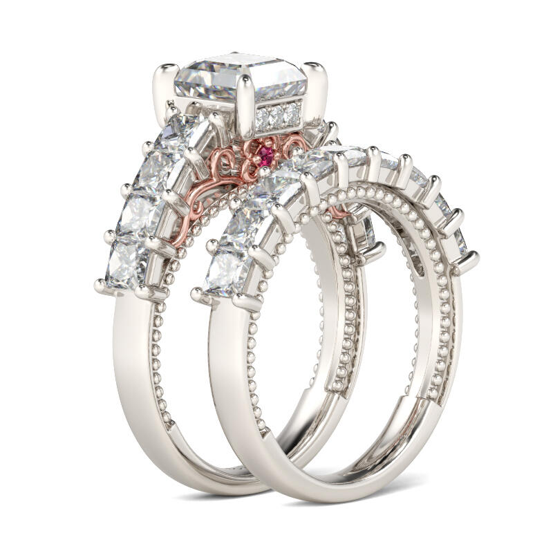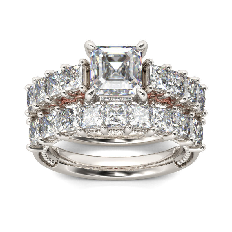 Stunning and classic, this ring set honors the light of your life. Crafted in two tone sterling silver, the engagement ring features a asscher-cut center stone set on a shimmering mount. Along the milgrain-edge shank, Shimmering round stones are set on the shank to add extra sparkle to it. With the carefully crafted coordinating band, the ring set show a sparkling and exquisite look from every angle. Treat yourself or surprised her with this masterpiece!