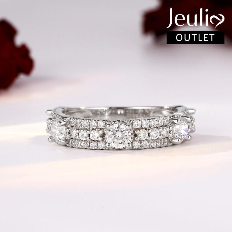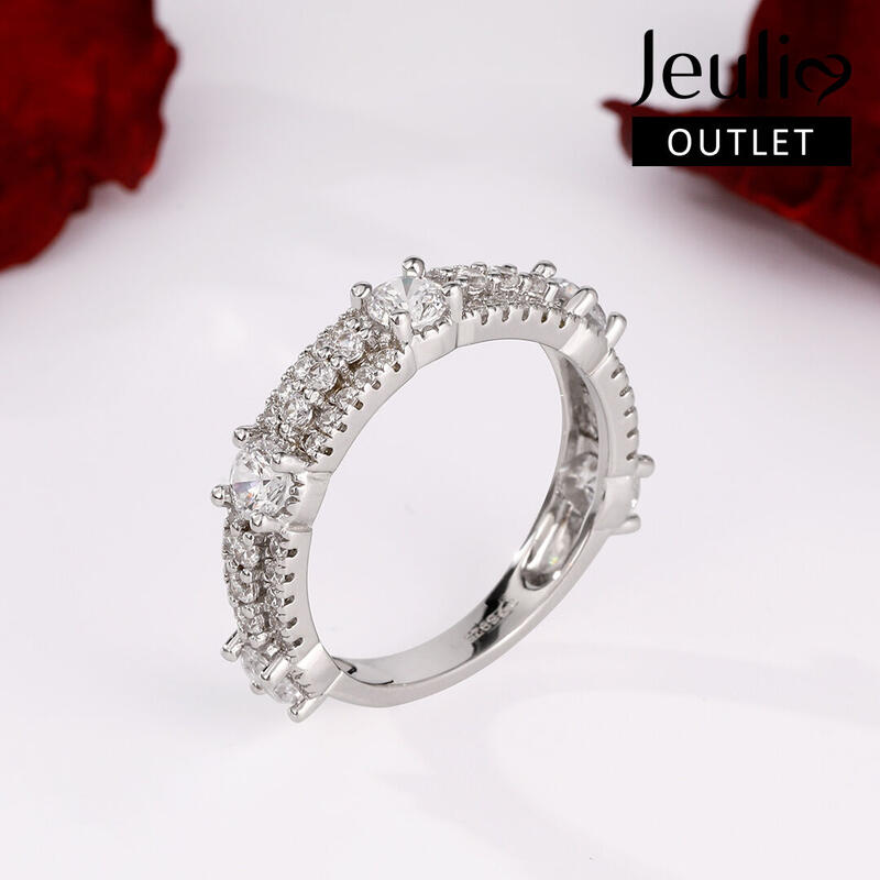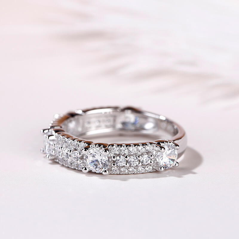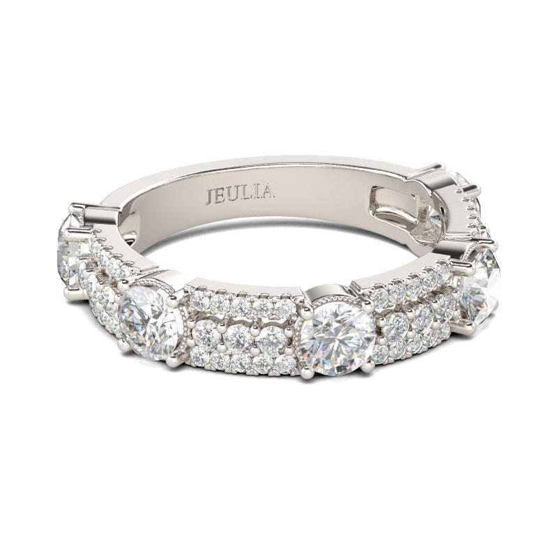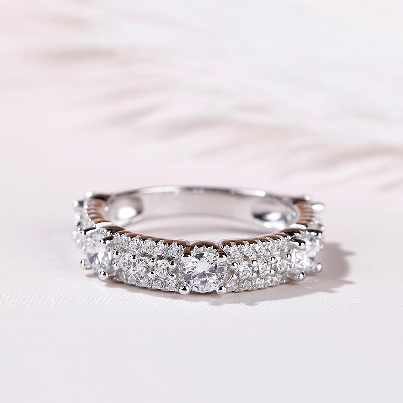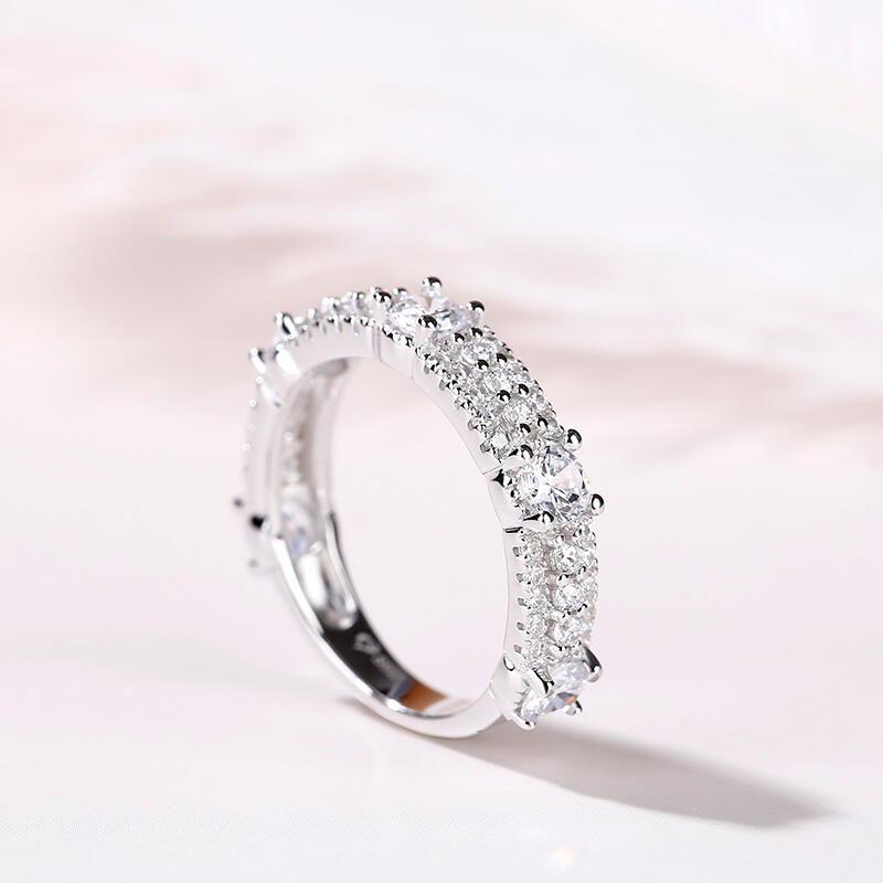 Be unique among the others. If sparkle is the goal, this shimmering band is the answer. Beautifully crafted in fine sterling silver,this band is set with five sparking round stones and rows of glistening little round cut stones.Simply dazzling, this beautiful style is sure to become a treasured keepsake.