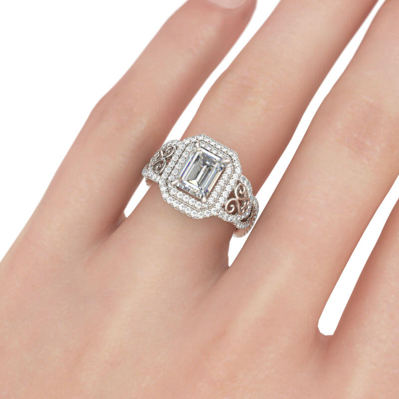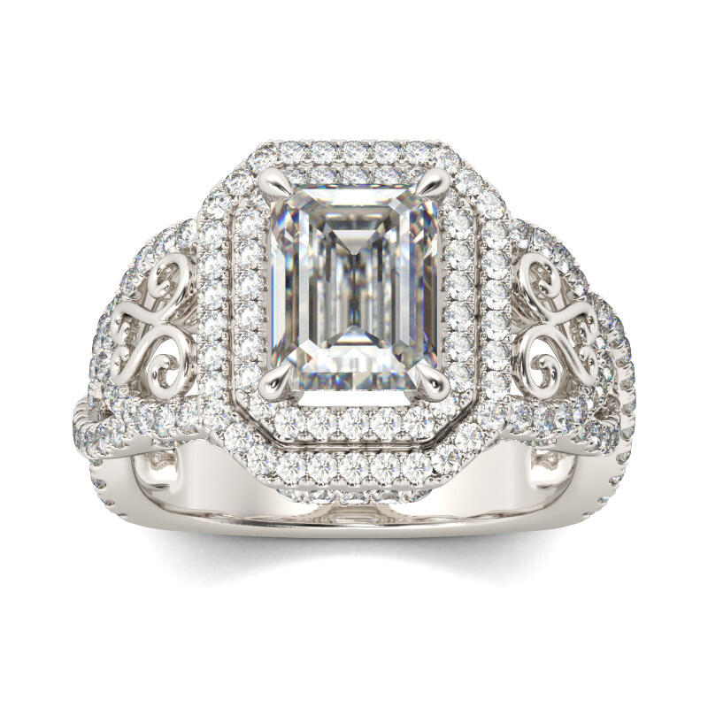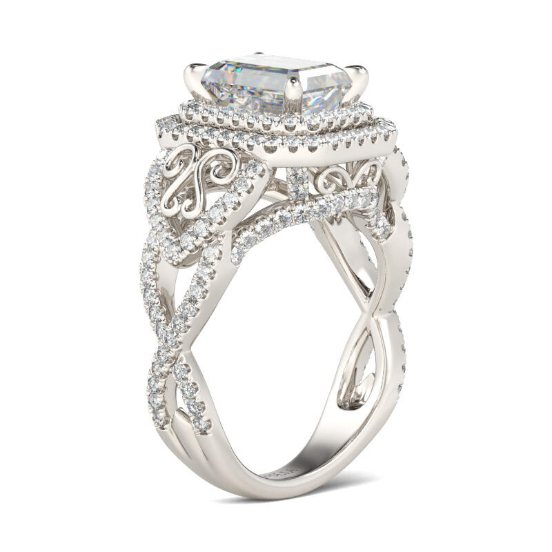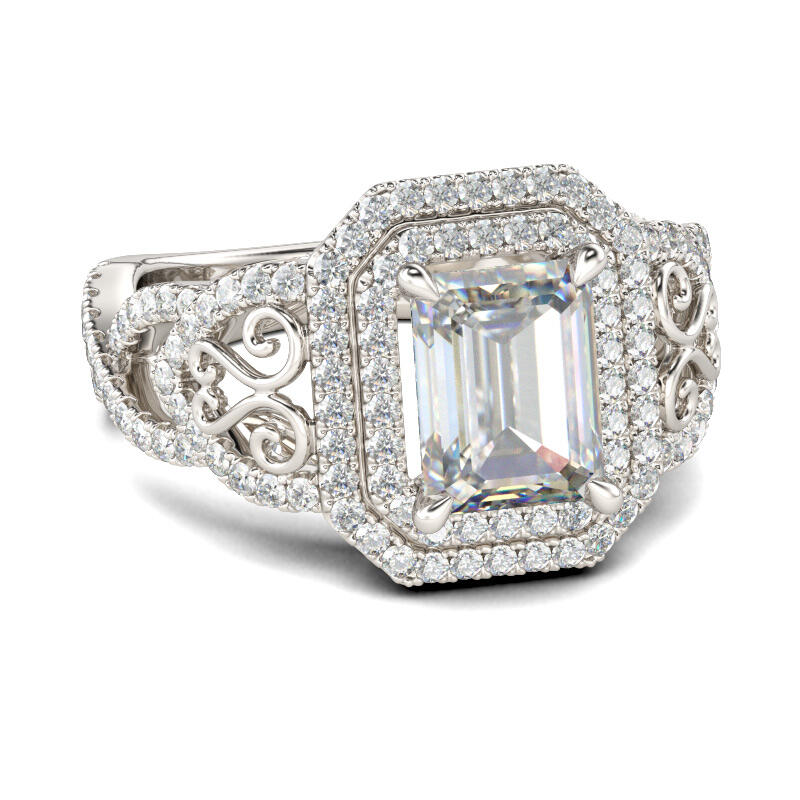 Emerald Elegance! This antique designed emerald-cut engagement ring is inspired from Victorian era style. The center stone is an emerald-cut Jeulia® Stone set in a double halo. The band includes a triple split shank with intertwined bands of sparkling stones and swirling filigree cutout accents. This is truly a one-of-a-kind design and will never be mistaken for another’s engagement ring. The intricacy of this design is vintage and antique inspired. Never miss the masterpiece!