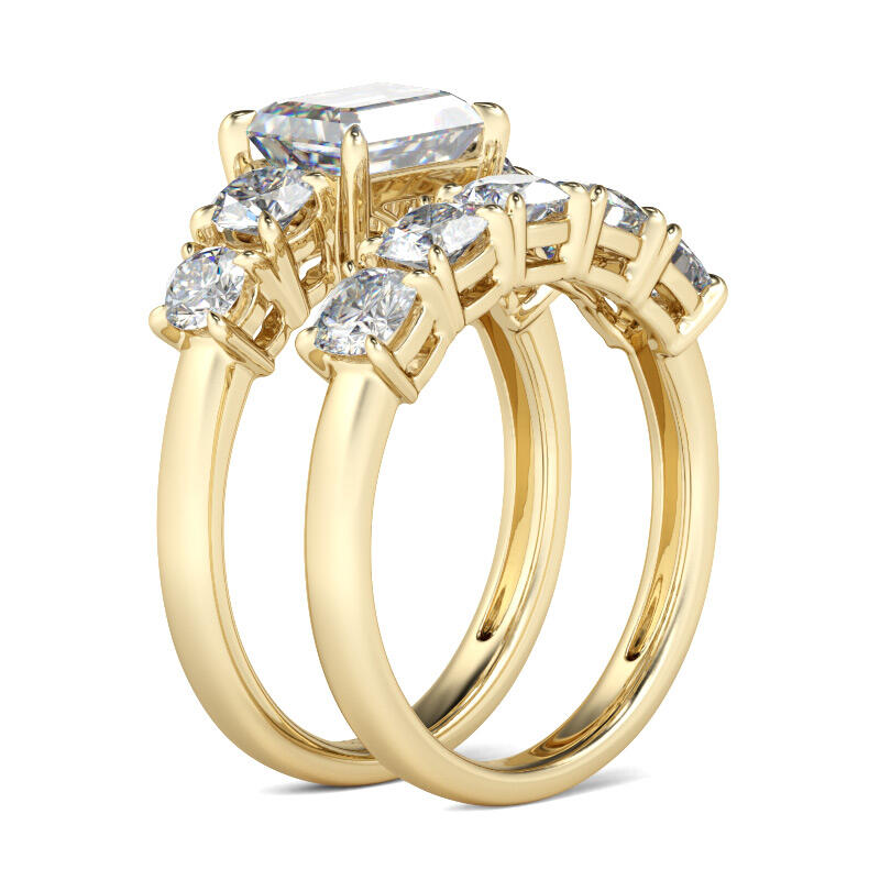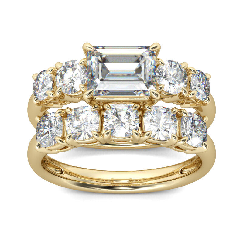 Sparkling and stunning, this ring set will be an eye-catcher everywhere. Crafted in gold tone sterling silver, the ring features a east-west setting emerald-cut center stone. Four glistening round stone are on the shank to complement the design. The coordinating band is set with five cushion-cut stones. The ring set will certain to show a dazzling look from every angle on your finger. Never miss it.