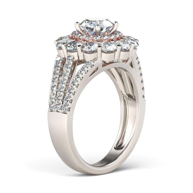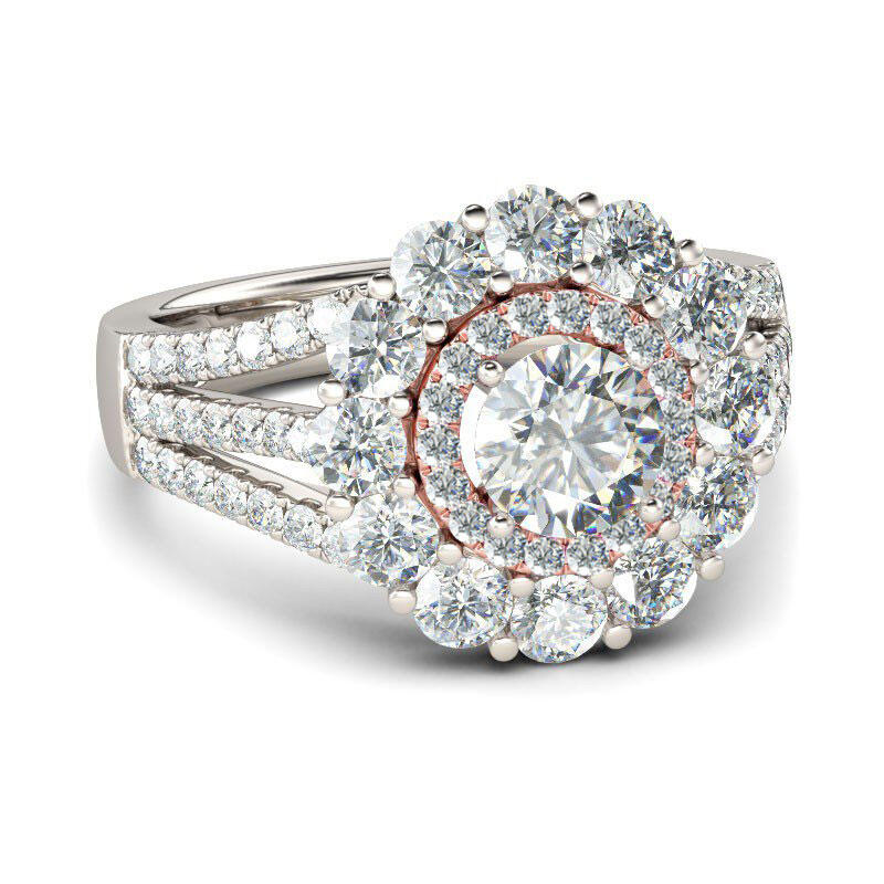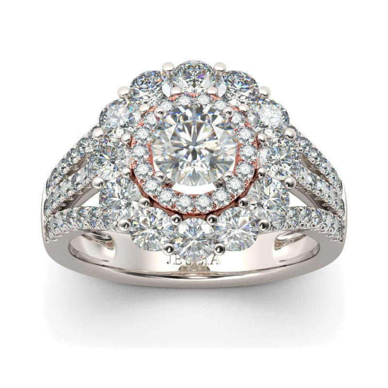 Beautifully crafted, this feminine style is sure to become a treasured keepsake. A sparkling round cut stone shimmers at the center of this style, while double halo frame add radiance and sparkle to the design. The sparkling round stones on the split shank evoke sophisticated beauty that cannot be duplicated. She'll know just how much she means to you with this glittering engagement ring on her finger.