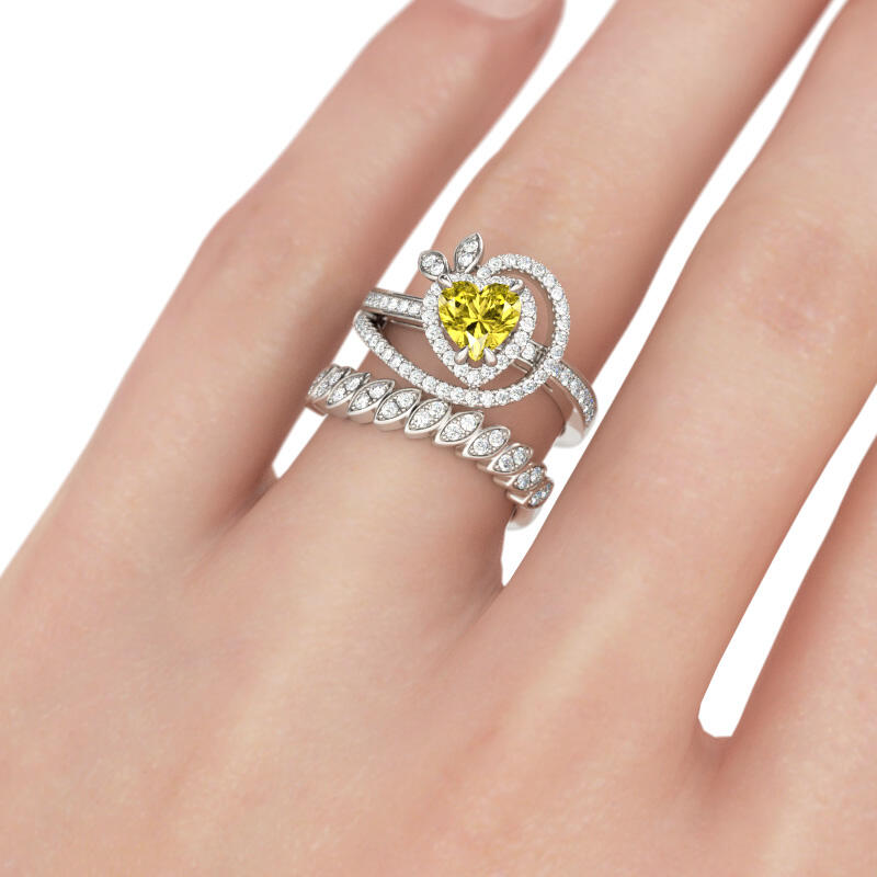 Sparkling and amazing, this ring set will capture your heart at first sight. Crafted in sterling silver, the engagement ring features a heart-cut center stone wrapped in a shimmering halo. With the coordinating band, the ring set will show a sparkling and beautiful look on your finger. Never miss it.