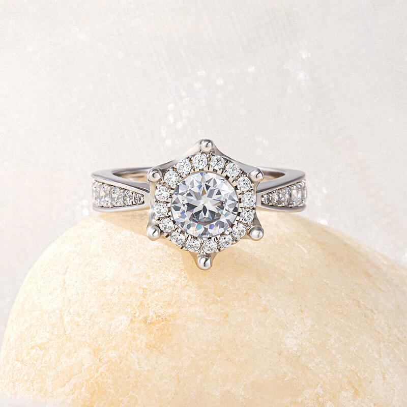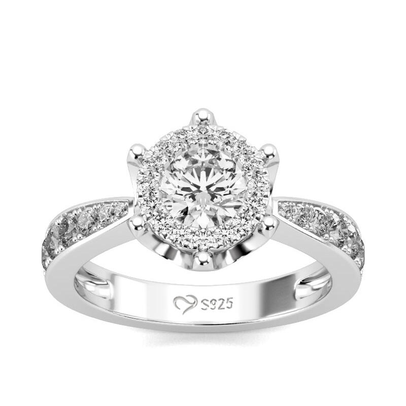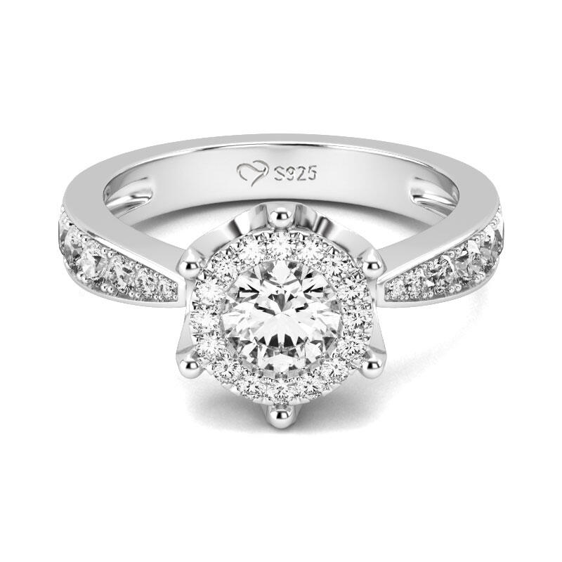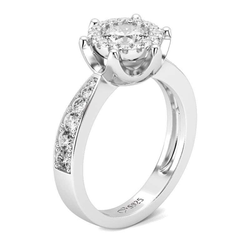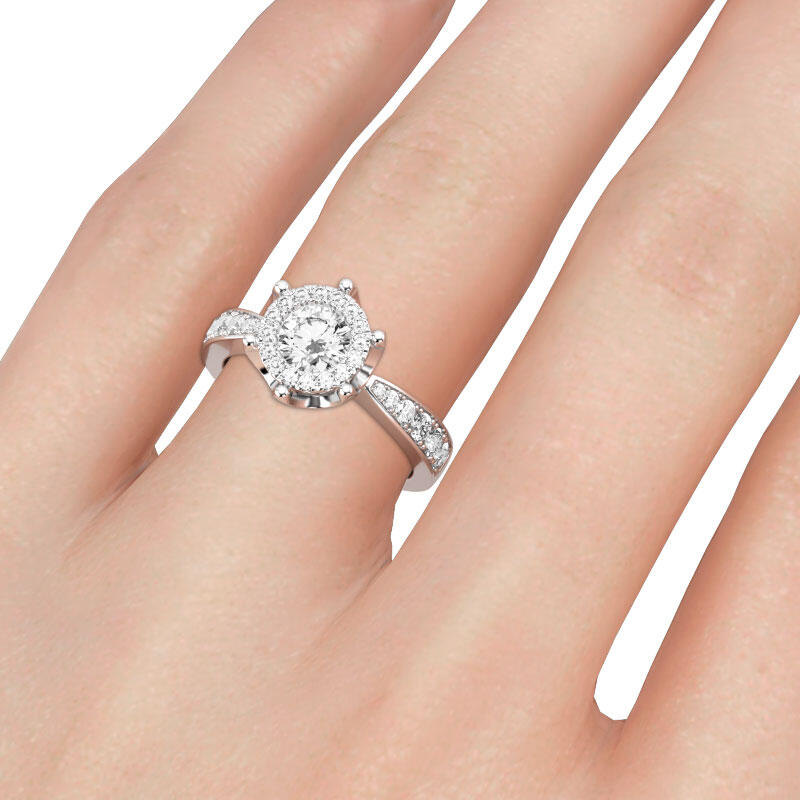 Express all the love you hold in your heart with this exquisite ring. The engagement ring showcases a round-cut center stone. A halo frame of smaller round stones wraps this center stone in a sparkling embrace, while additional stones line the ring's shank. On that special day, when you ask for her hand in marriage, honor her with this exquisite ring.