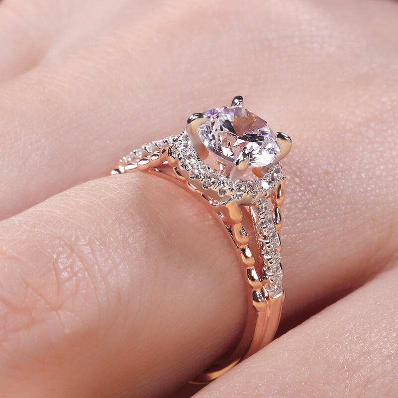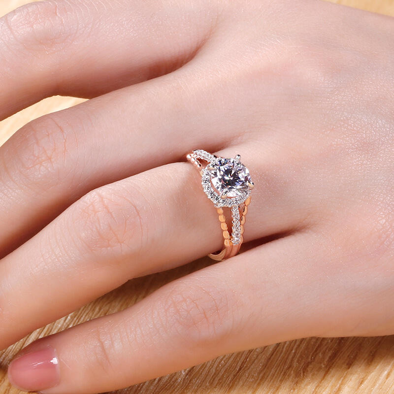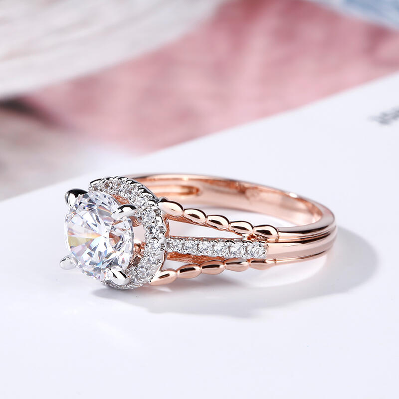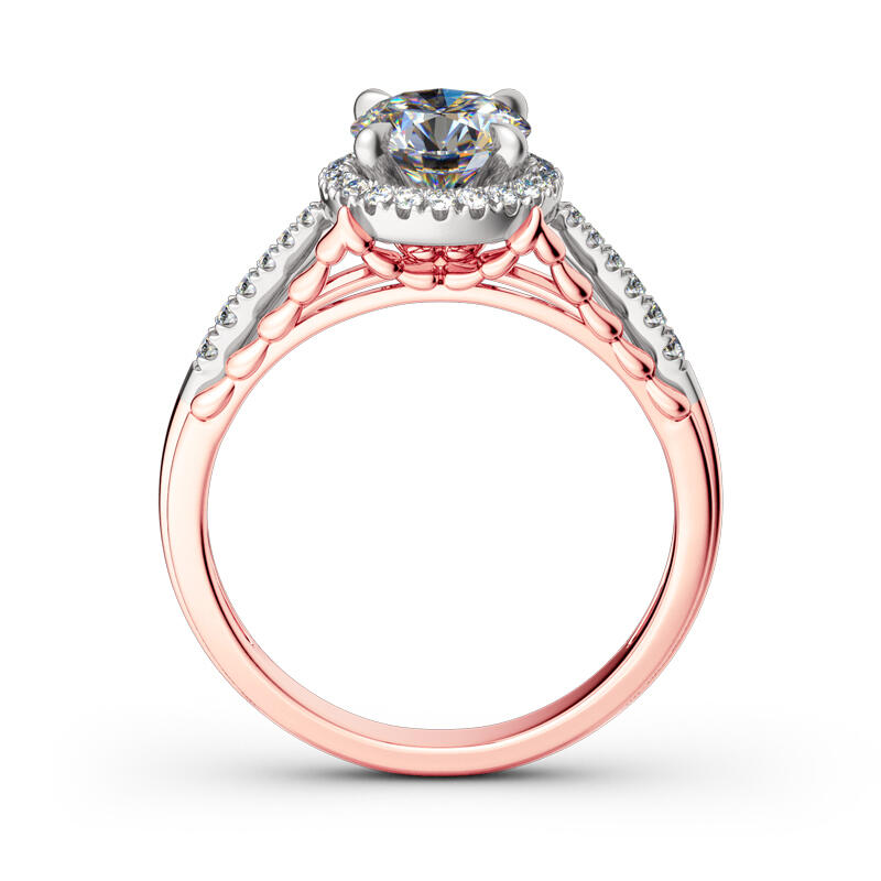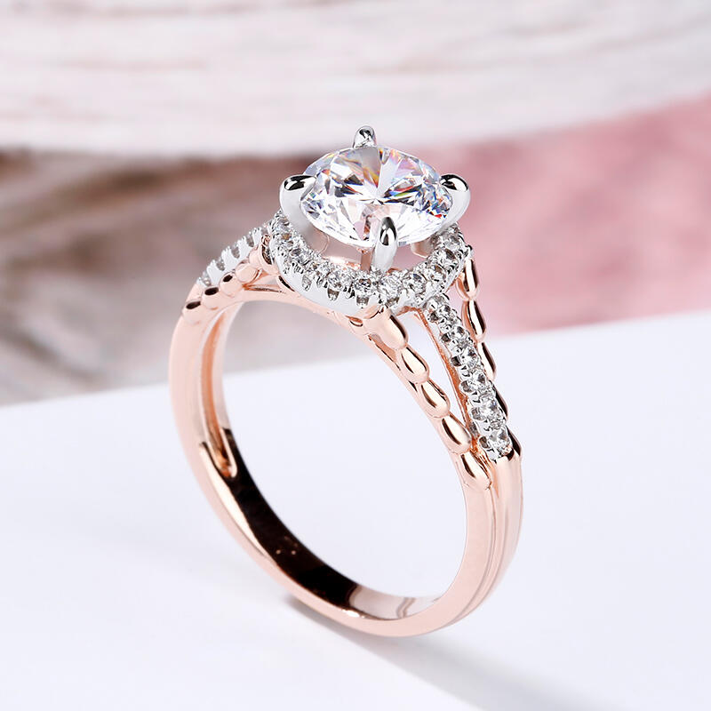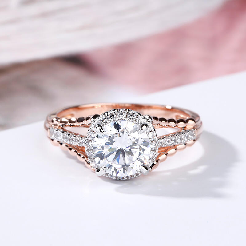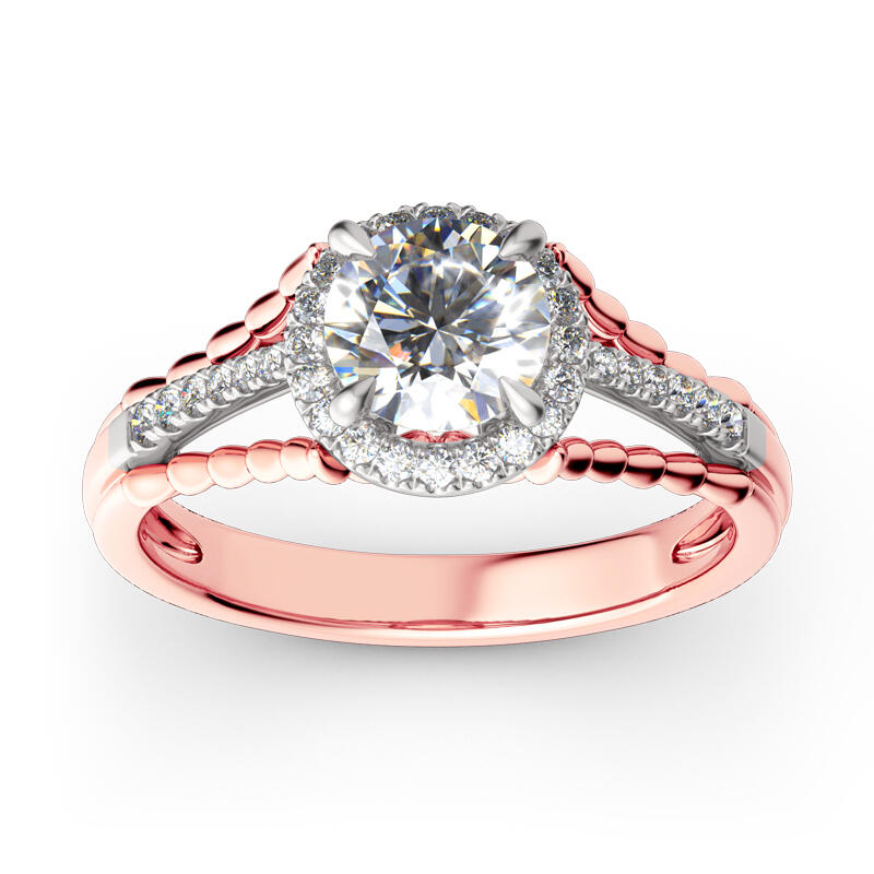 Exquisite and unique, this engagement ring will be an eye-catcher everywhere. Crafted in two tone sterling silver, the ring features a round-cut center stone wrapped in a shimmering halo on a two tone split shank. The shank is sculptured in bead design to create a vintage and unique look. The glistening ribbon in the middle to add extra spark to the ring.