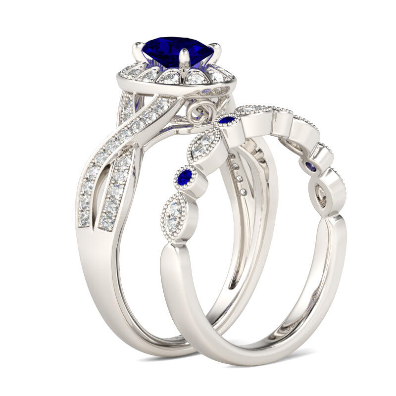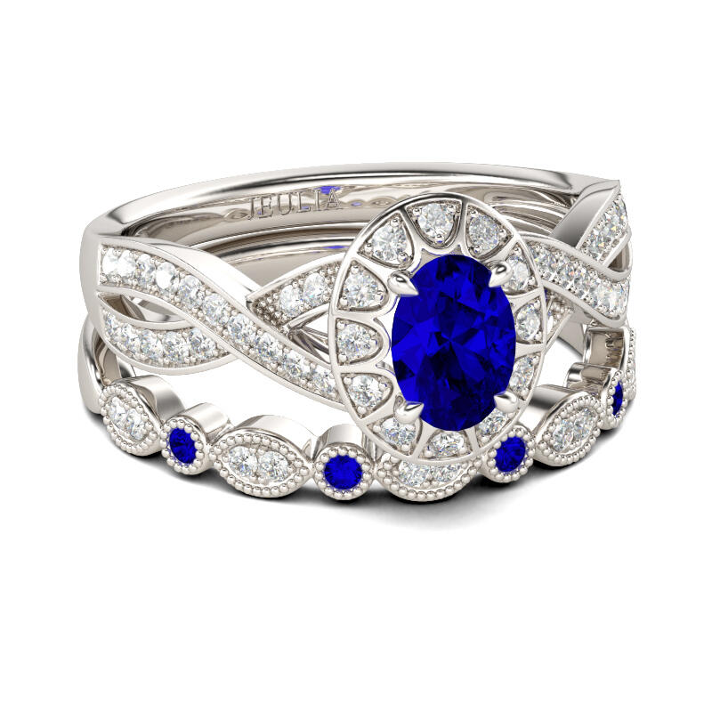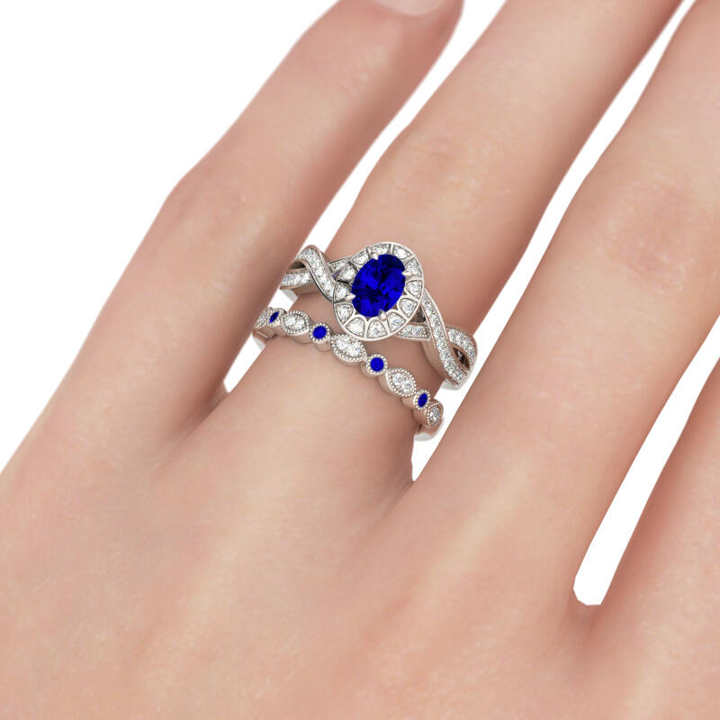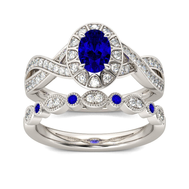 Elegant and sparkling, this ring set will capture your heart at first sight. Crafted in sterling silver, the engagement ring features an oval-cut center stone wrapped in a glistening halo. Shimmering stones adorn the ring's twisting shank. With the coordinating band, the ring set shows a vintage and stunning look from every angle.