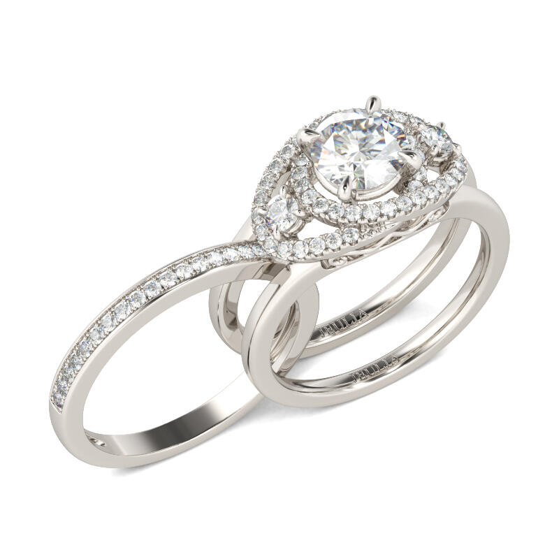 Unique and elegant, this ring set will be an eye-catcher everywhere. Crafted in sterling silver, the ring features a round-cut center stone wrapped in a intertwined frame on a wide polished split shank. The coordinating band can be inserted into the split shank to complement the design add extra sparkle to it. Treat yourself or surprise her with this stunning piece this holiday.