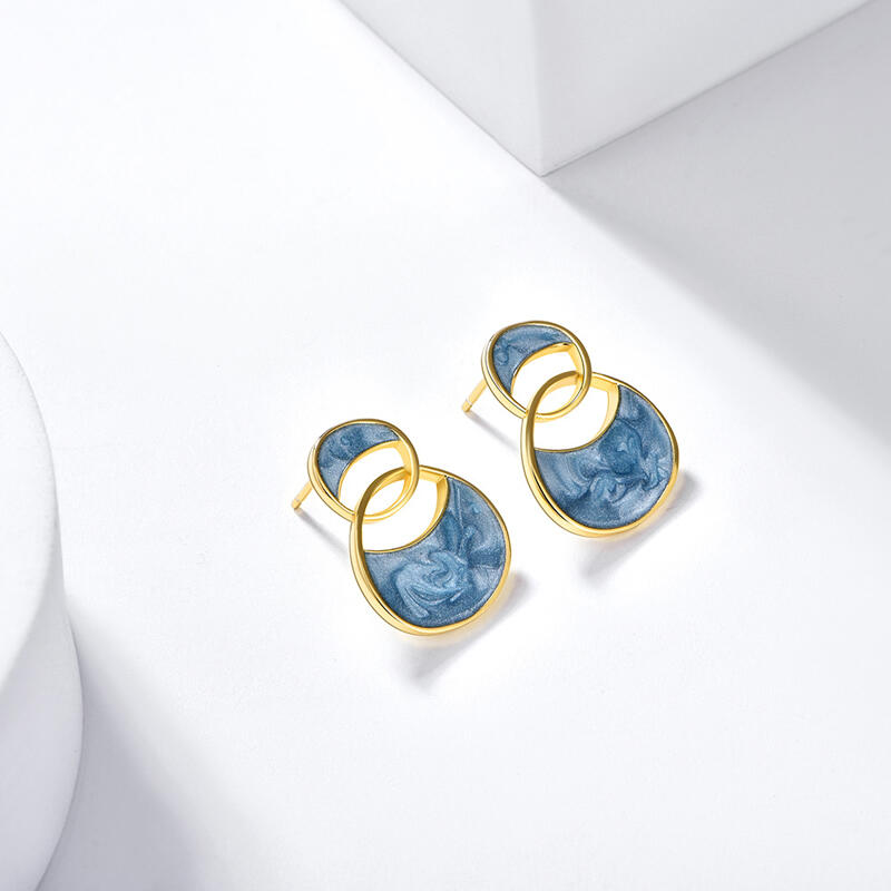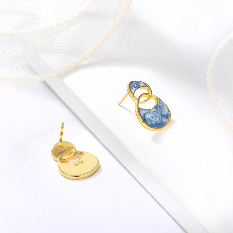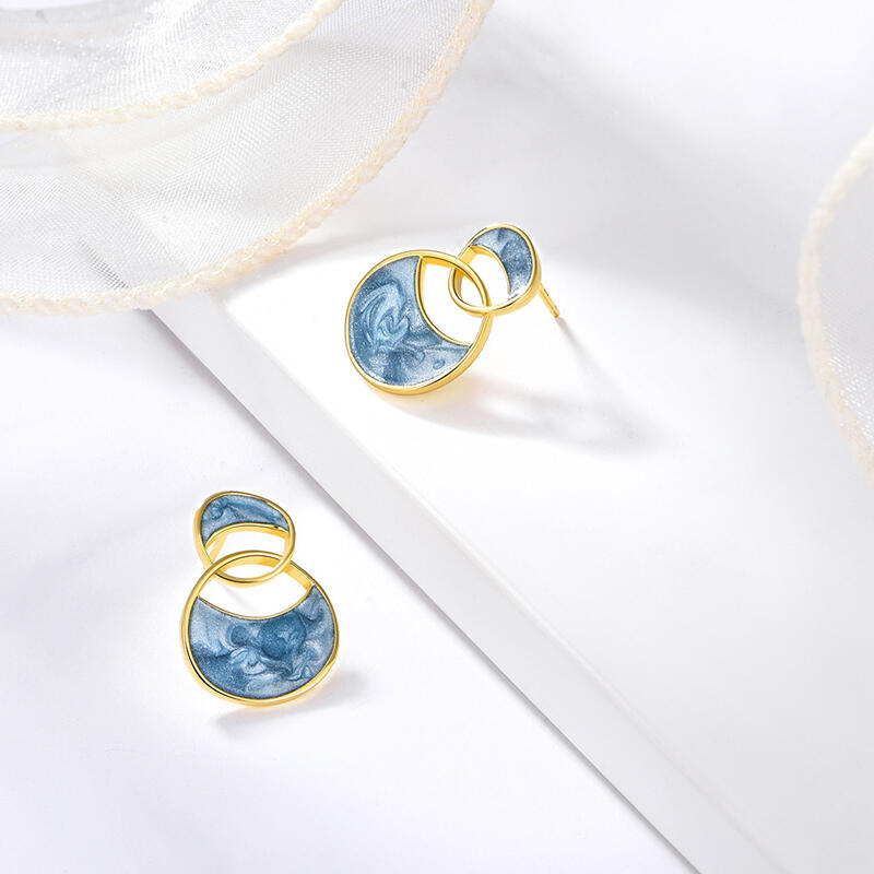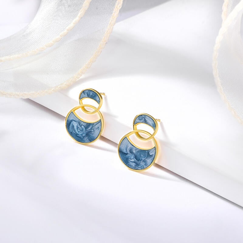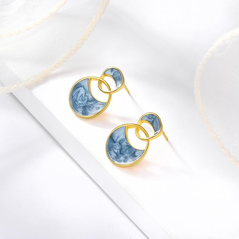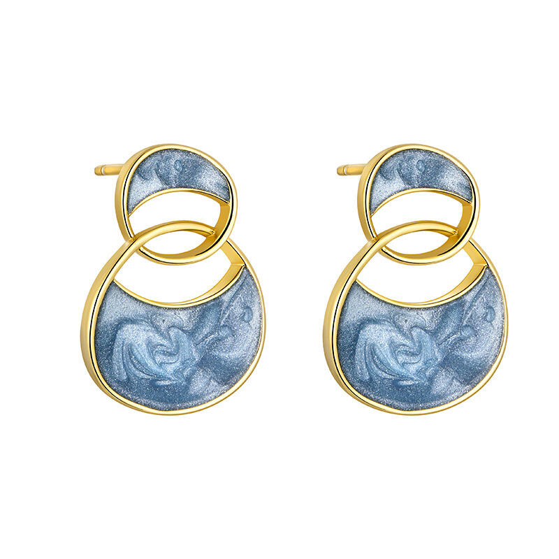 Two circles meet and become the silhouette of these earrings. Featuring a pair of interlocking circles, these stud earrings have a simple design that easily fits a variety of styles. The sky blue color is serene and beautiful, and delicate earrings have never looked cuter.