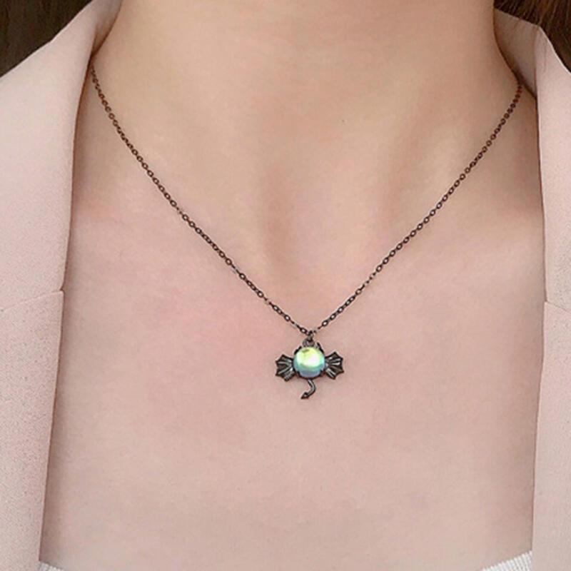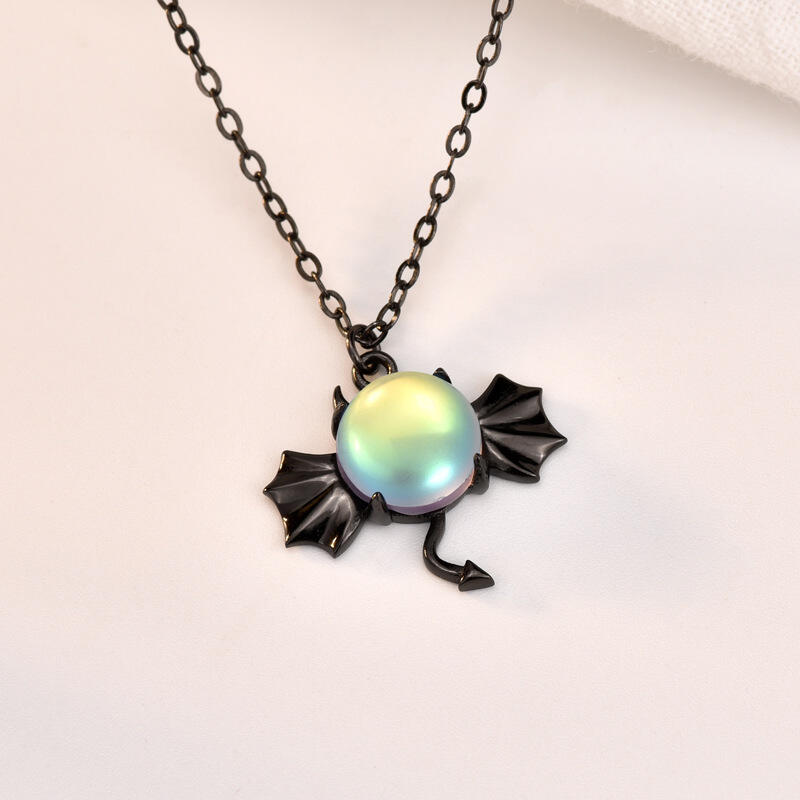 Devilishly sexy, you can bring some dark glamour to your look with this fabulous devil necklace. Crafted in sterling silver, this necklace features a moonstone adorned with devil horns, wings and tail, completes a fabulous yet naughty look. Go ahead and follow that little devil voice inside your mind!