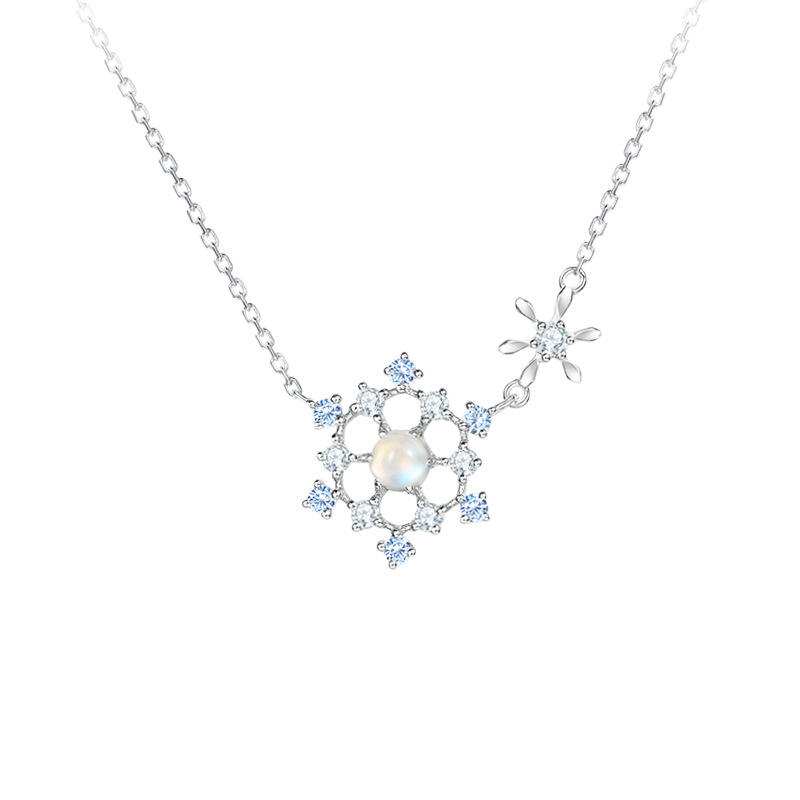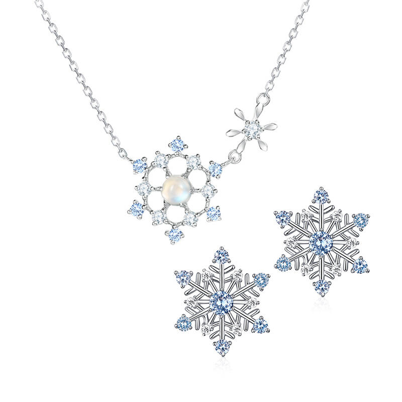 These snowflake pieces capture the beauty and intricacy of a snowflake gently falling from the sky during a winter snow. Each designed is full of detailing, finished with sparkling white and blue stones to make it really shine on your ear and neck.