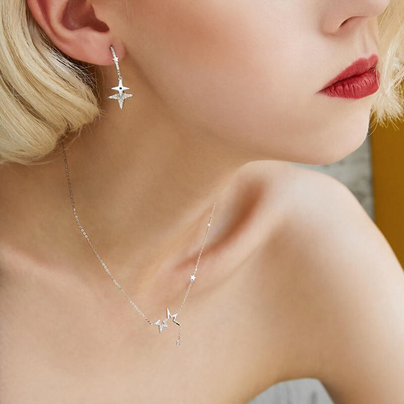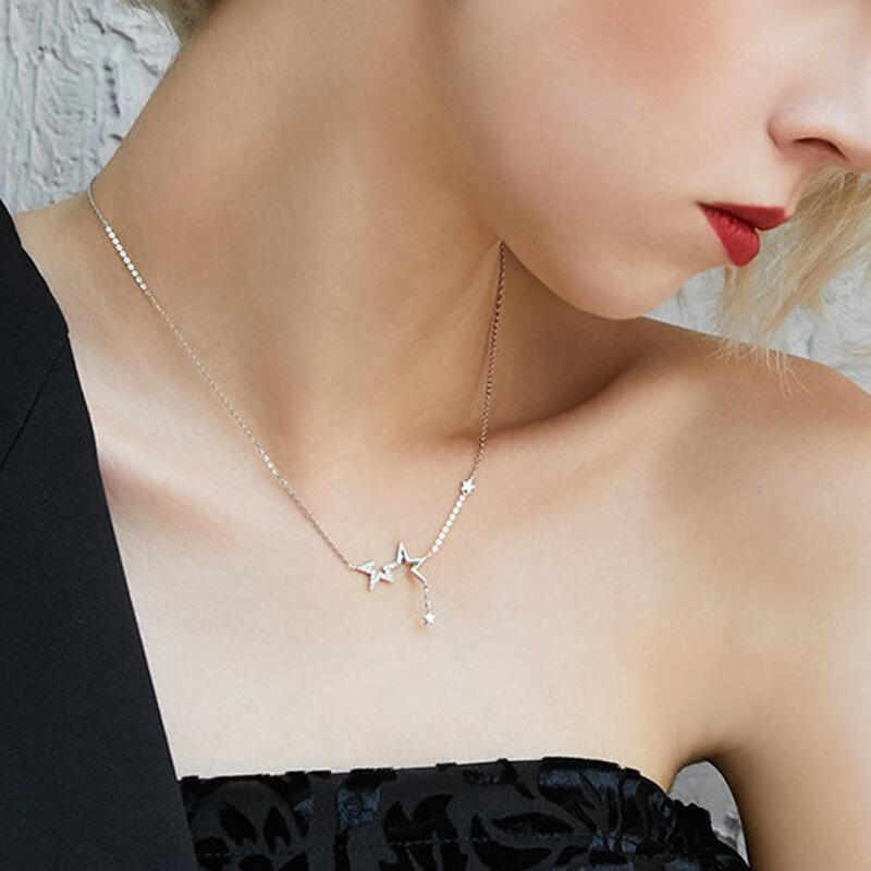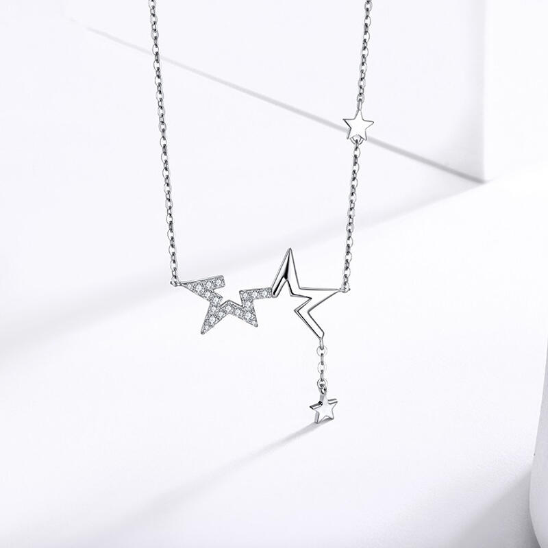 Light up the night in this special twinkling star necklace featuring a two half-star outlines with two smaller stars hanging and dangling. The shimmering stones add eye-catching sparkle to the sterling silver design.