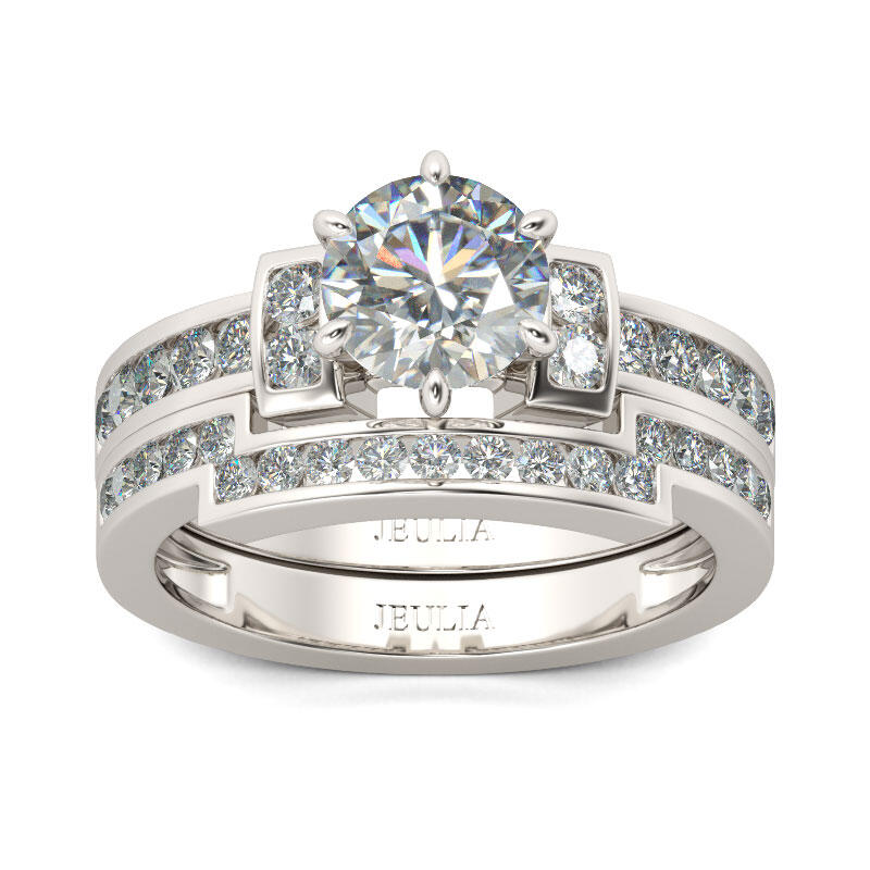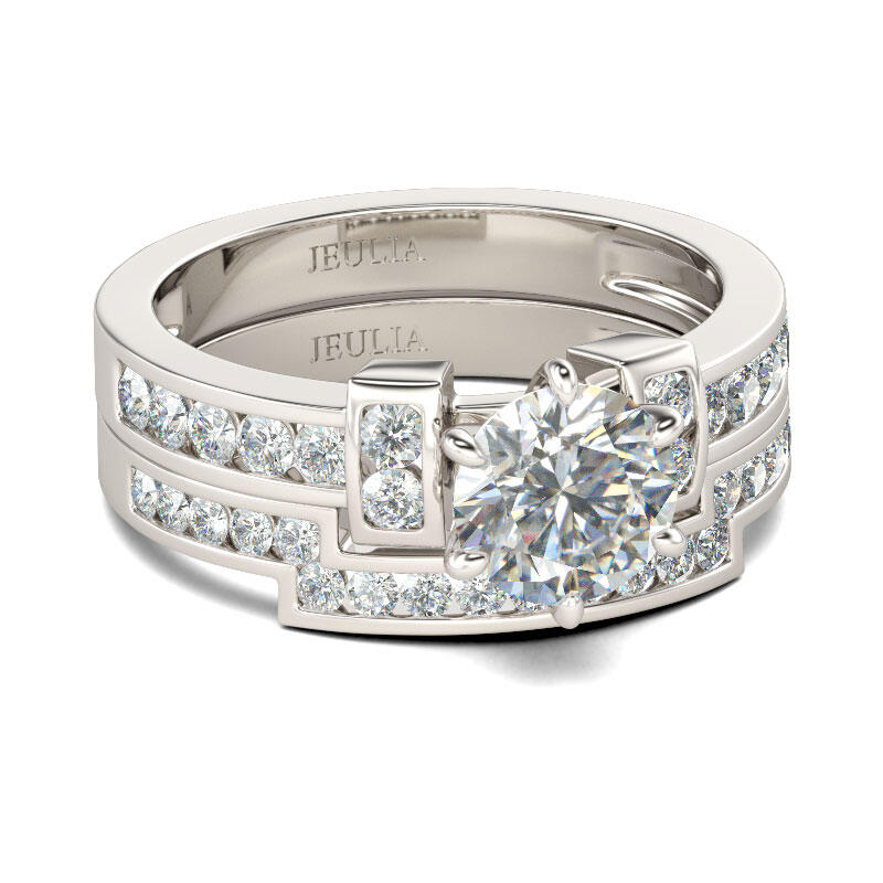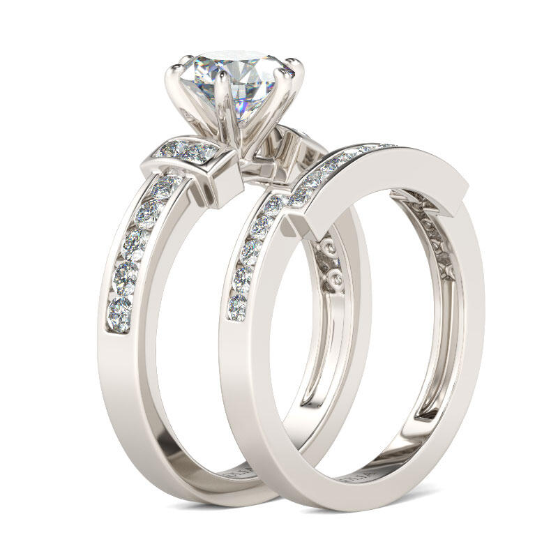 Ask for her hand with the elegant ring, and seal your commitment with an equally beautiful wedding band. Glamorous and classic, this exceptional bridal set will forever express your eternal love and undying commitment.