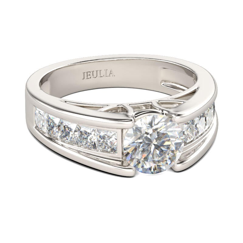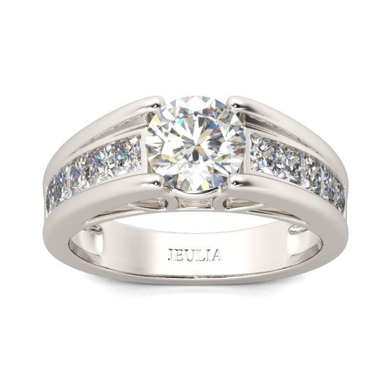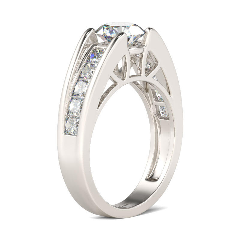 Promise to love her for a lifetime when you present her with this elegant engagement ring. Simple and stunning, this ring showcases a sparkling round stone shines at the center while a row of princess cut stones adorn shank to add more sparkle to the design. The stones in this engagement ring shine brightly enough to be deserving as a symbol of your love.