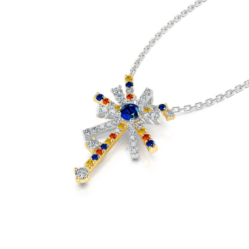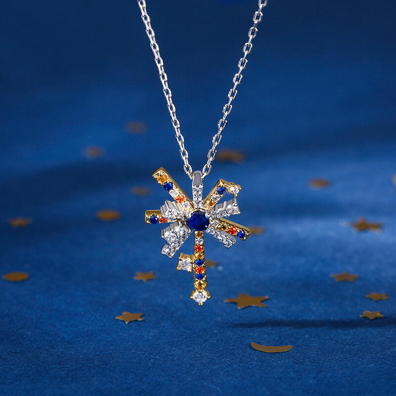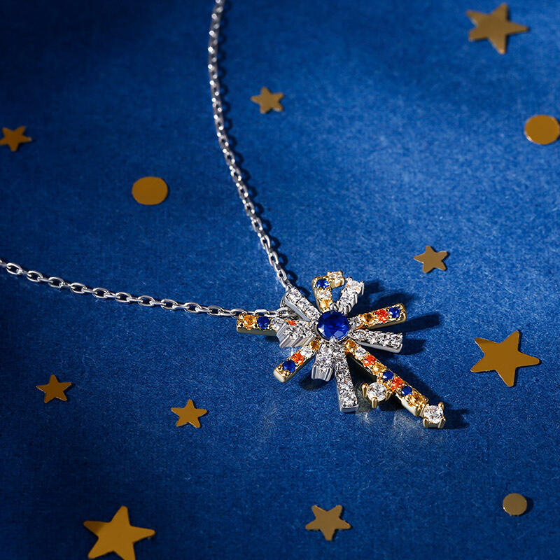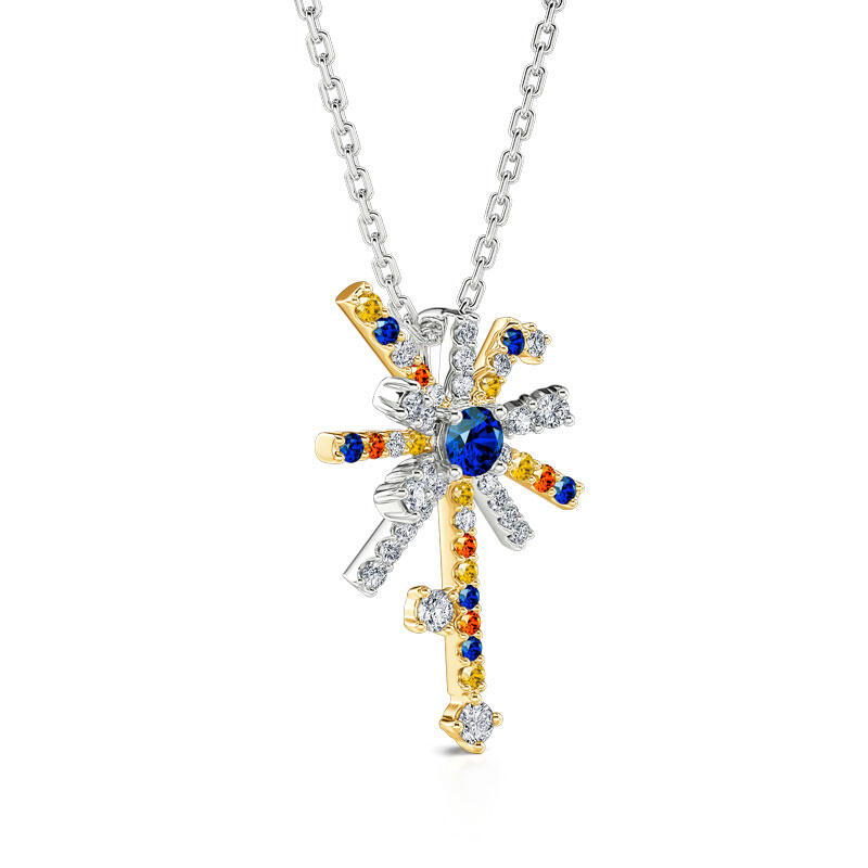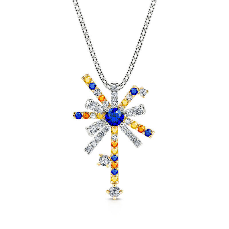 This fireworks necklace features a single burst of fireworks illustration with precious stones like yellow, sapphire and white in sterling silver, creating a beautiful contrast with their vibrant colors in various shapes. The necklace is designed as a celebration of life’s most cherished moments, inspired by the variously colored sparkling shapes of fireworks with its captivating bursts of light and colour when they spiral into the sky.