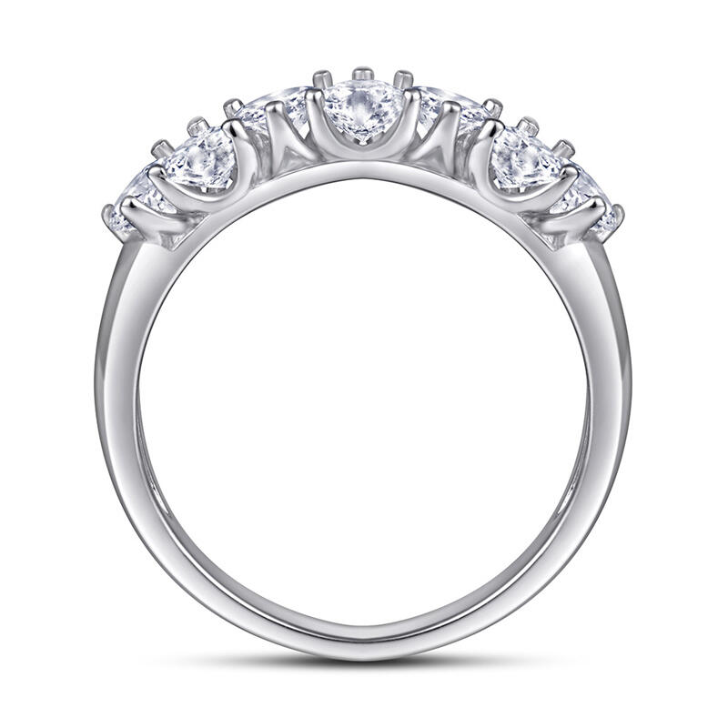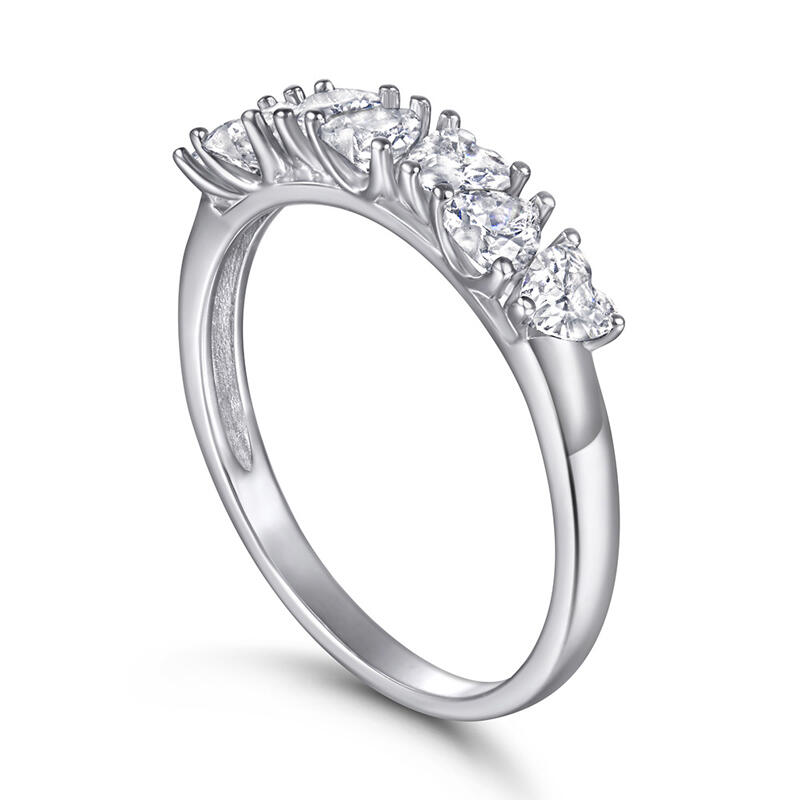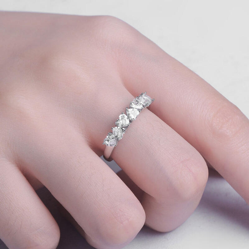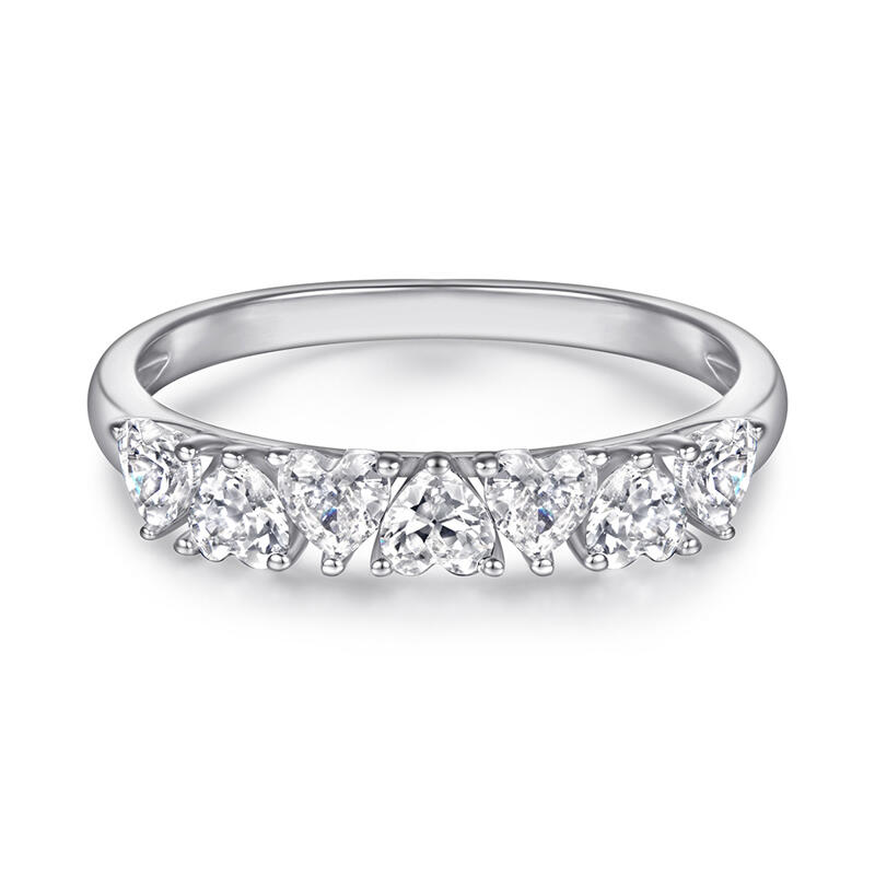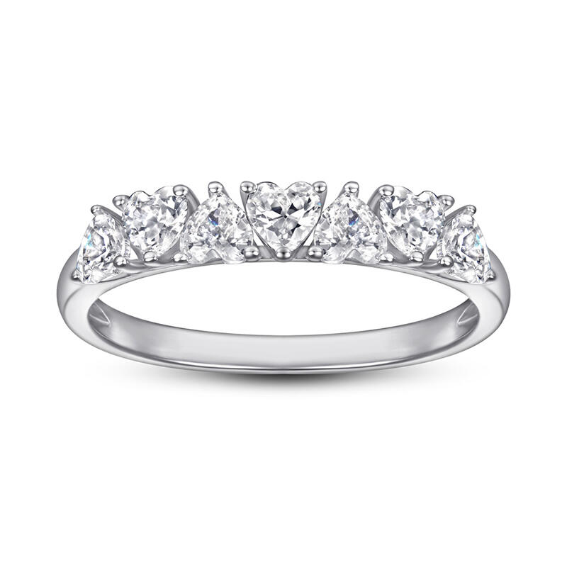 So pretty and romantic. Seven heart-cut white stones, each set in the opposite direction of the other causing it to catch the light from every angle. With shiny color and stones, this band shows a really elegant and exquisite on your finger.