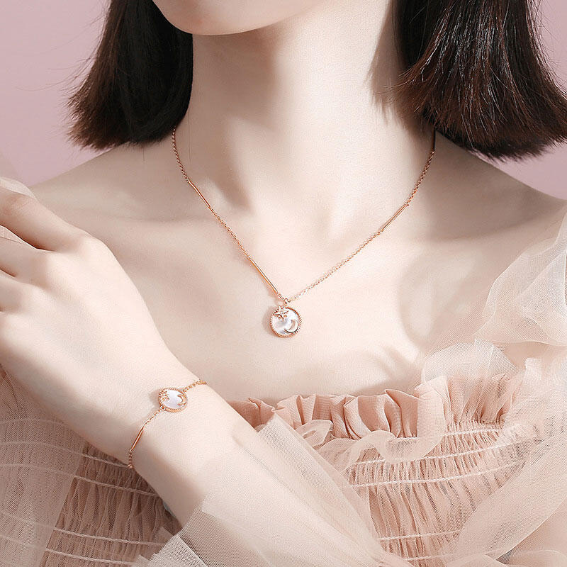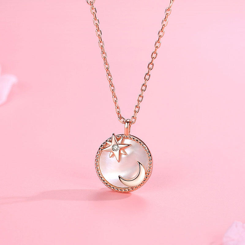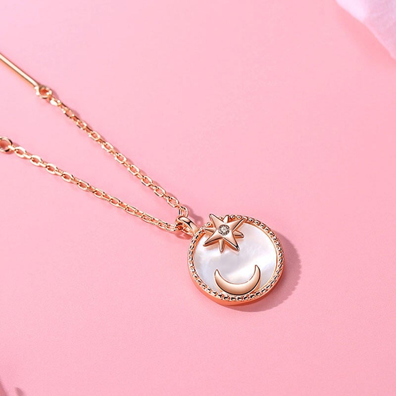 This necklace is full of magic and use it as moon pendant which brings peace, true love and friendship. The rose gold necklace showcases the luminous mother of pearl shell inlay which contrasts with the wonderful shiny surface of the star&moon sign design.
