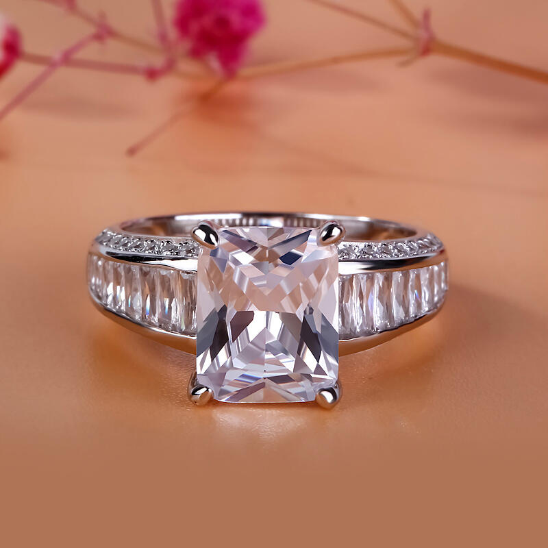 Dazzling and unique, this engagement ring will capture your heart at first sight. Crafted in sterling silver, the ring features a large radiant-cut center stone set on a glistening mount and invisible-set sidestones on the cambered shank. With the shimmering paved stones on the sides of the ring, it will sparkle crazily on your finger. It's an adorable holiday gift for yourself or loved one. Never miss it.
