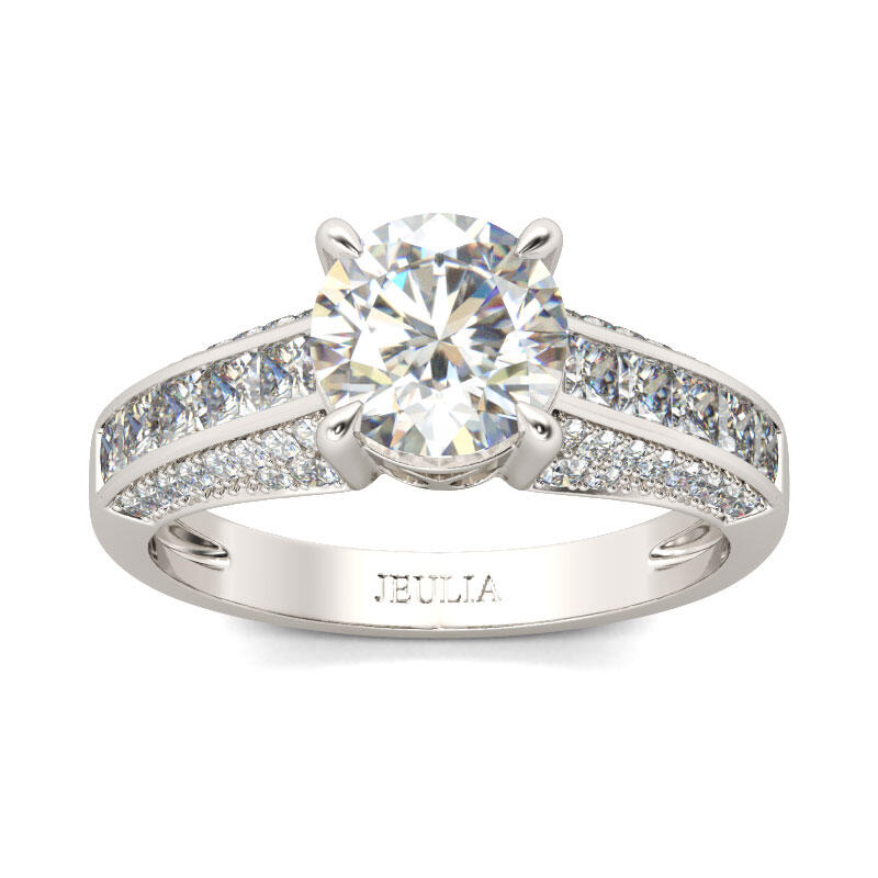 Simple but not plain, this engagement ring makes an adorable gift for loved one or yourself. Crafted in sterling silver, this ring features the three-side paved stones on the shank, which create a dazzling look for the ring from every angle . With the round-cut center stone, the ring will show timeless elegance and beauty. Treat yourself or surprise her with this masterpiece.