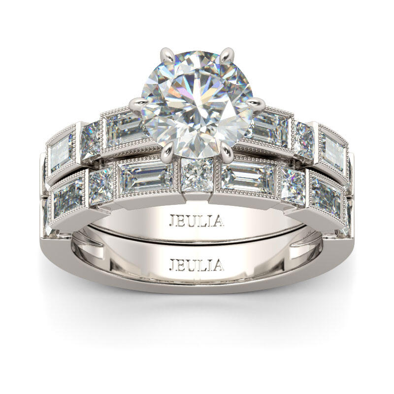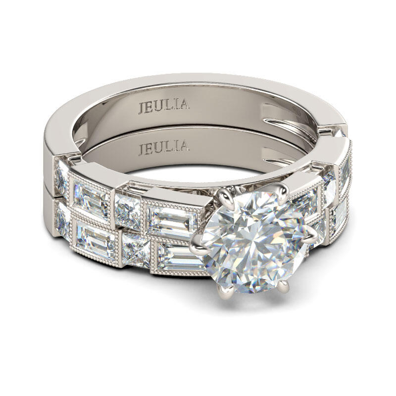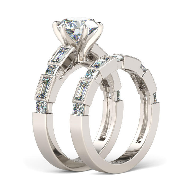 Make the moment magical with this exquisite ring set. Expertly crafted in sterling silver, this ring showcases a round-cut center stone on a glistening shank. The emerald-cut and radiant-cut stones are set on the shank to ensure enough sparkle. With the sparkling wedding band, this ring set is certain to take your breath away.