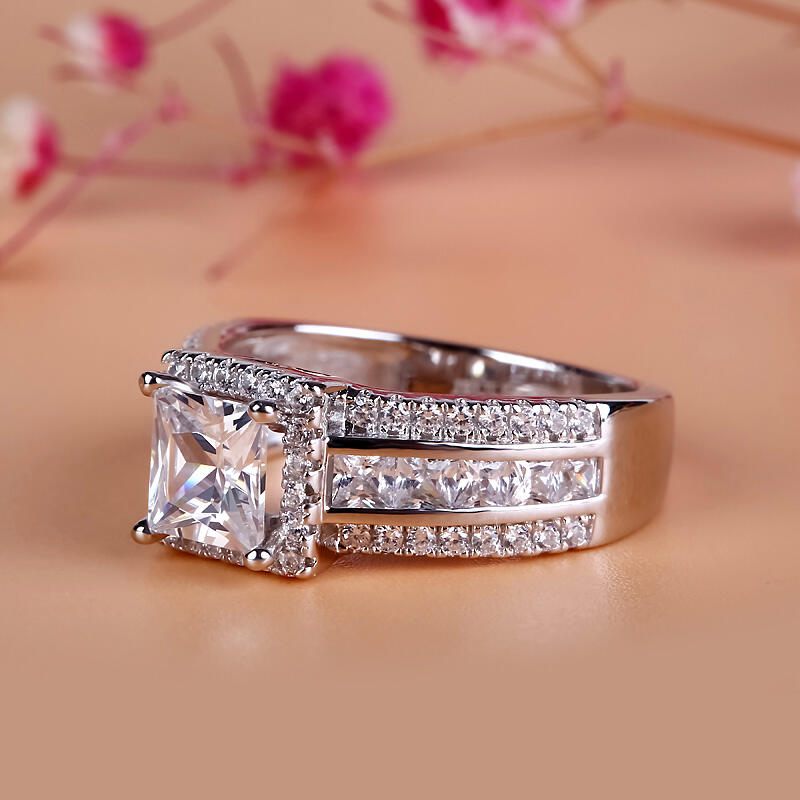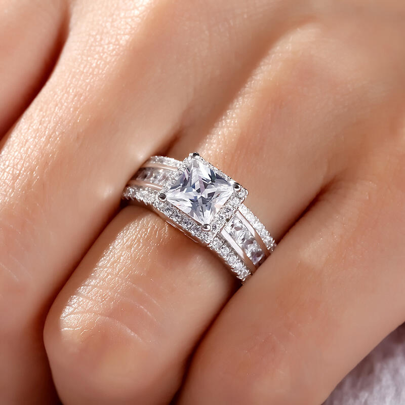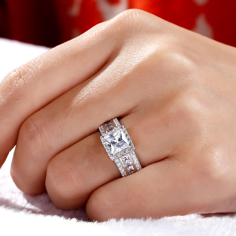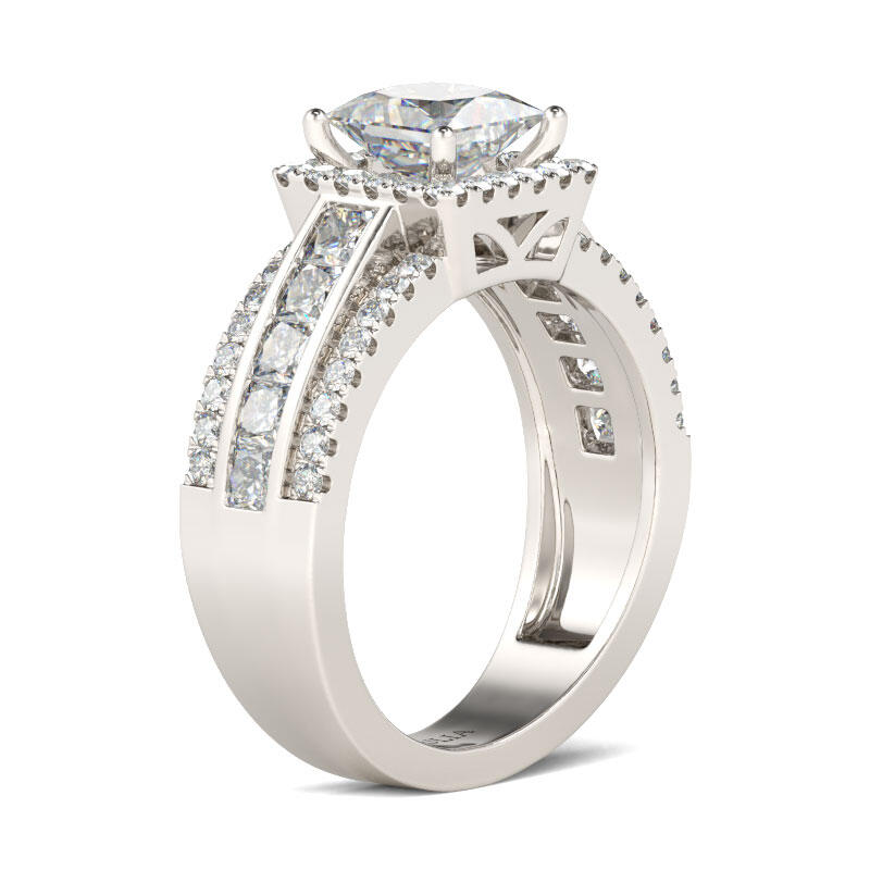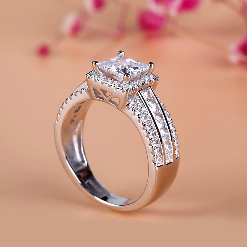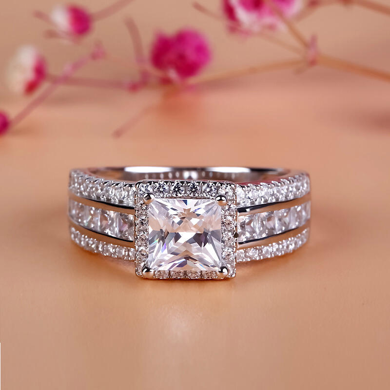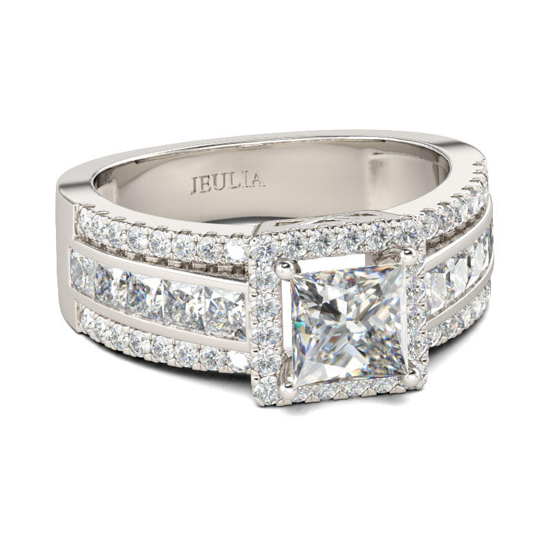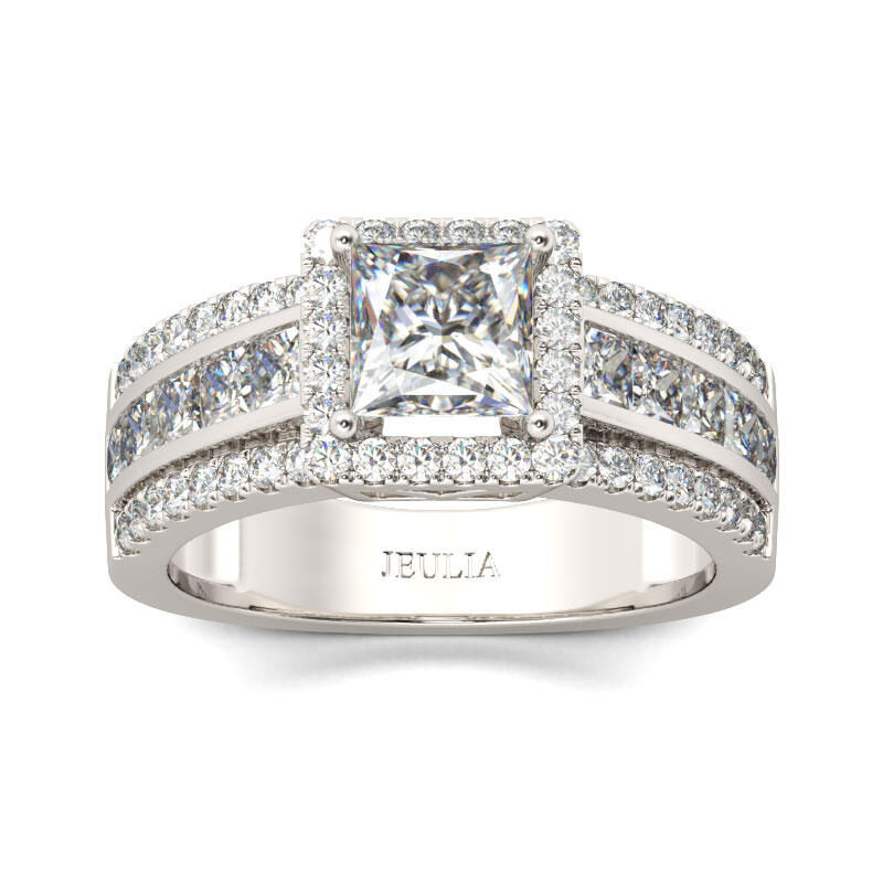 Love is in the air - and on her finger - with this splendid engagement ring. Crafted in sterling silver, this modern style features a sparkling princess-cut center stone wrapped in a halo frame of round stones. Along the shank, three rows of stones lend more drama to the design. An elegant choice, this stunning ring shares your vision of the future.