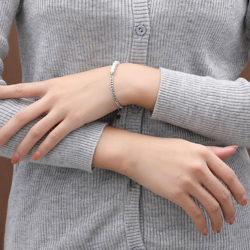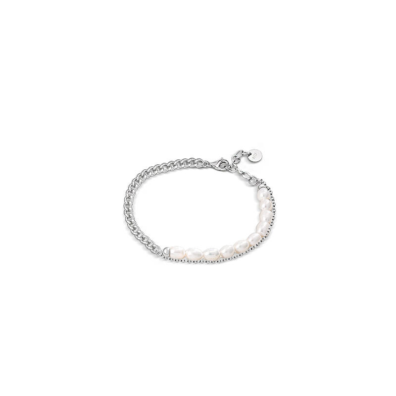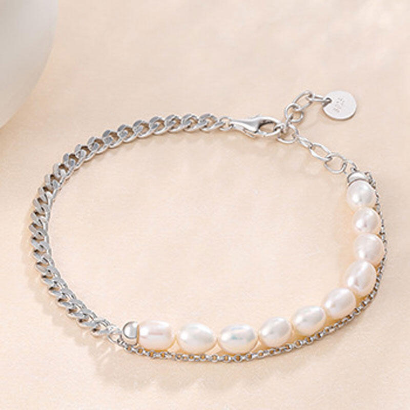 Crafted in sterling silver, this bracelet features a half pearl, half gold plated chain for a fun yet elegant piece. Add an element of surprise to your wardrobe with this demi pearl and chain bracelet.