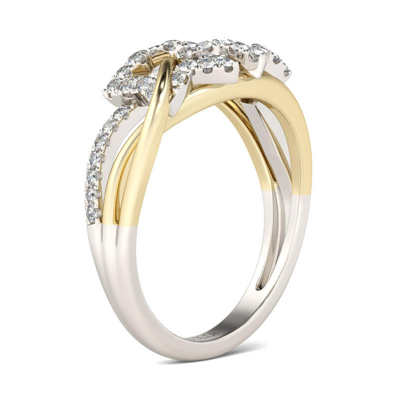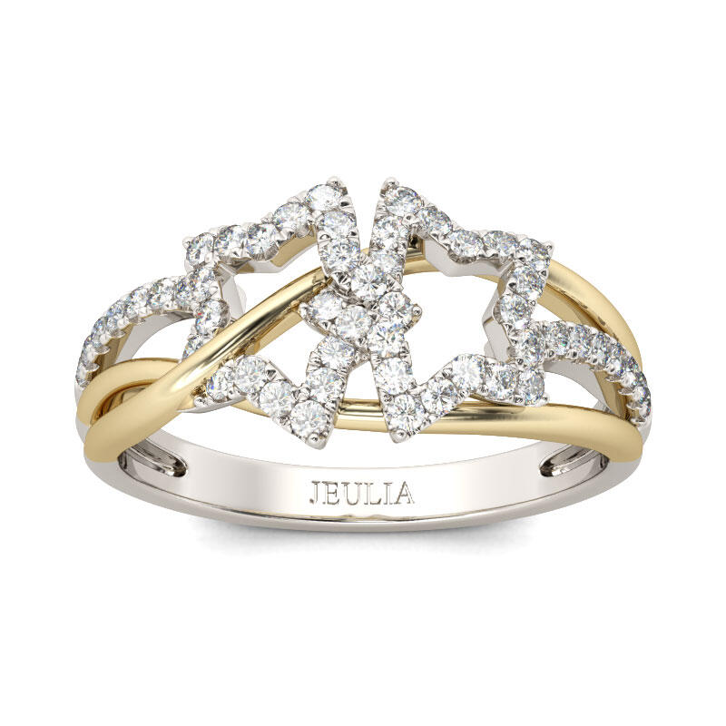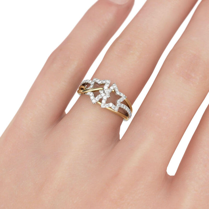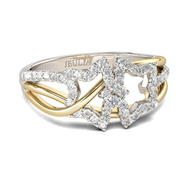 Light up your life with this star ring. Star is a fashionable and attractive motif in jewelry design. Crafted in two tone sterling silver, this ring showcases a stylish look with two shimmering stars on a two tone intertwined shank. The gold tone ribbons get through the stars with polished shine. It makes an adorable gift for Mom, children, friends or yourself. Never miss it.