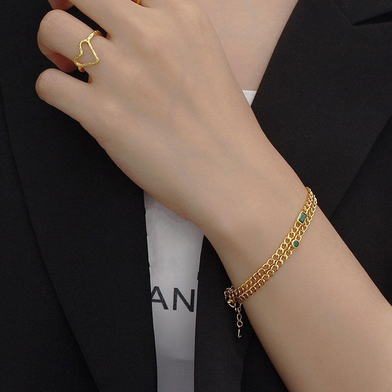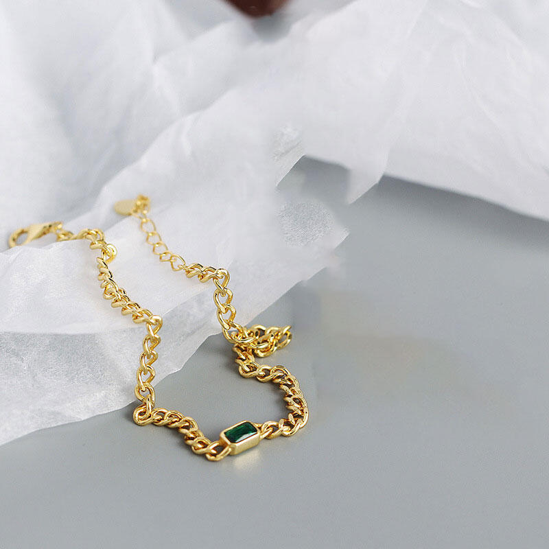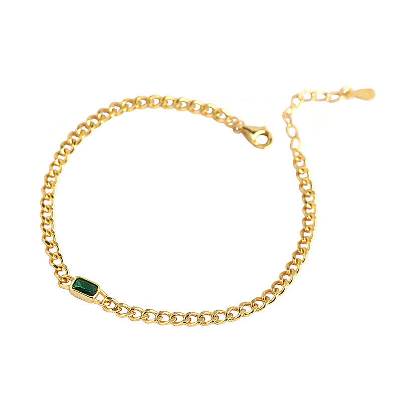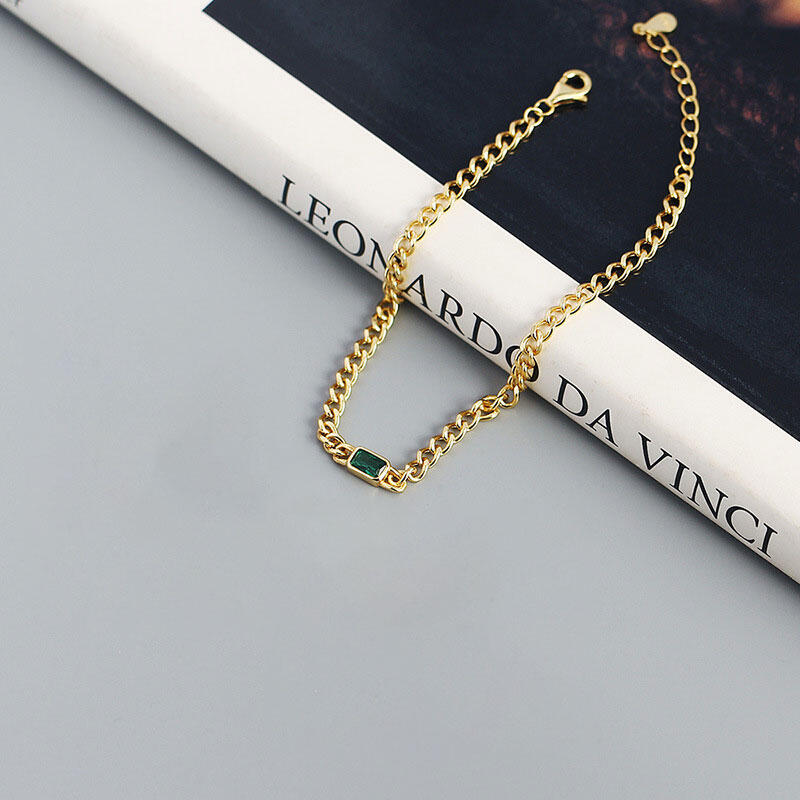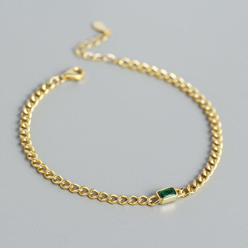 An exquisite modern take on a classic the bracelet embodies the romance of a bygone era. A fine yellow gold tone cuba chain elegantly features a central stone handset in a emerald cut rectangle. Bring sparkling to your wrist with this delicate Bracelet.