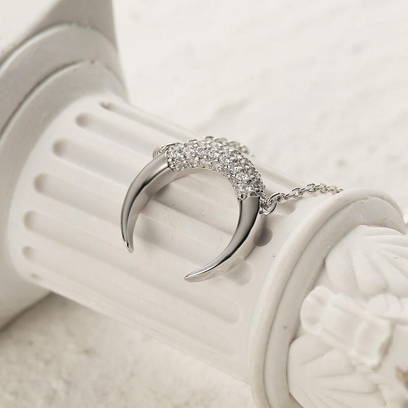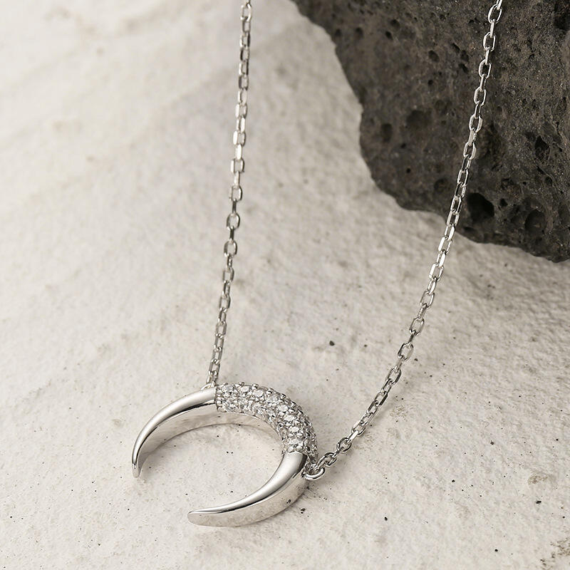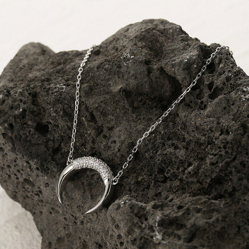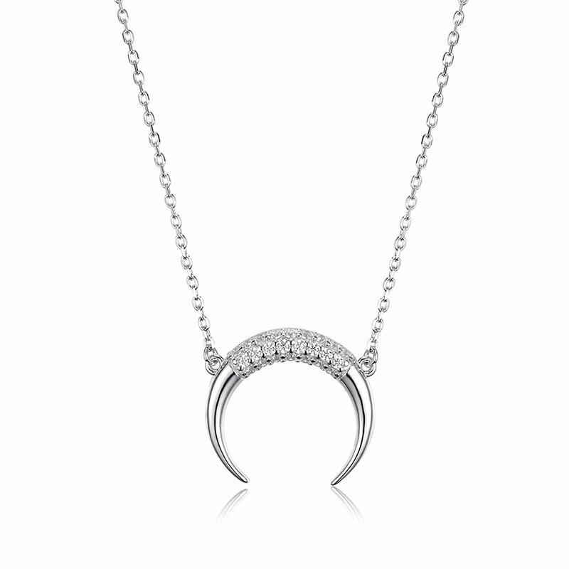 Mysterious and bewitching, this exquisite moon pendant draws all the right kinds of attention. Created in sterling silver, this design features glistening white stones wrapping the middle part of the moon, exuding graceful lights. Complete your casual looks with this sleek moon pendant.