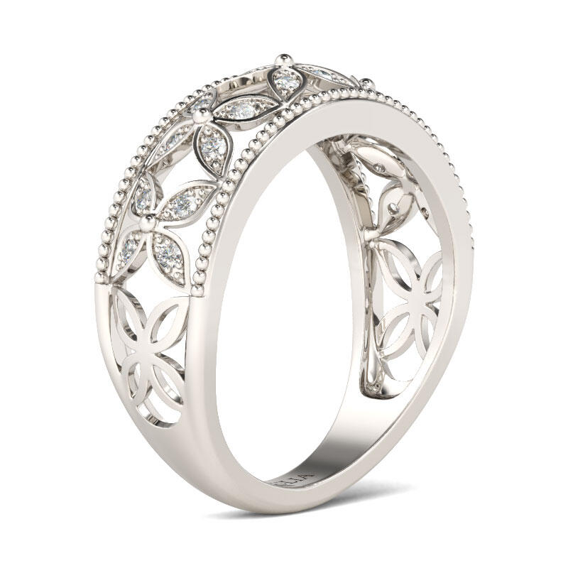Dainty and delicate, this wedding band makes an adorable gift for loved one or yourself. Crafted in sterling silver, the band features six flower are sculptured in the cutout shank. Milgrain detailing adorns the edge to create a vintage look for the band. With the shimmering round stones on the petals, the band shows a sparkling look. Treat yourself or surprise her with this simple but beautiful piece.