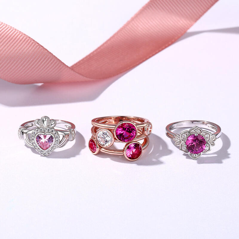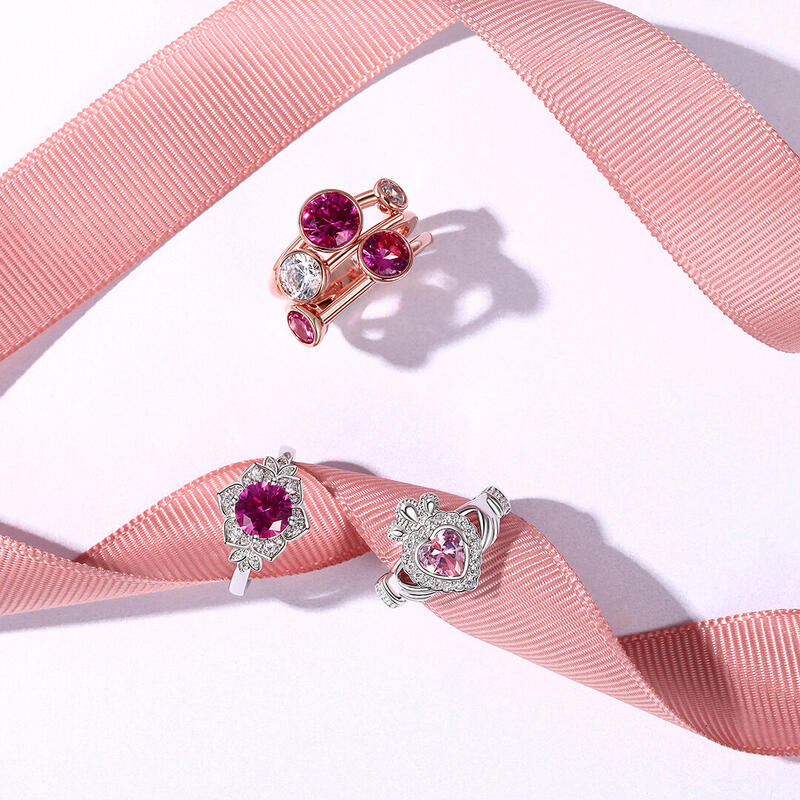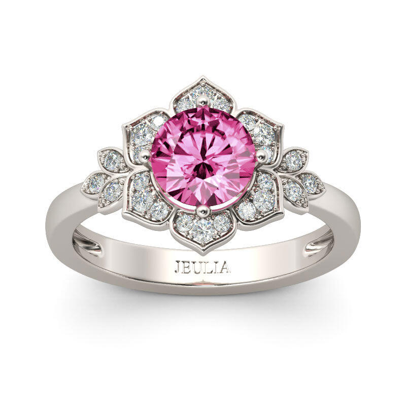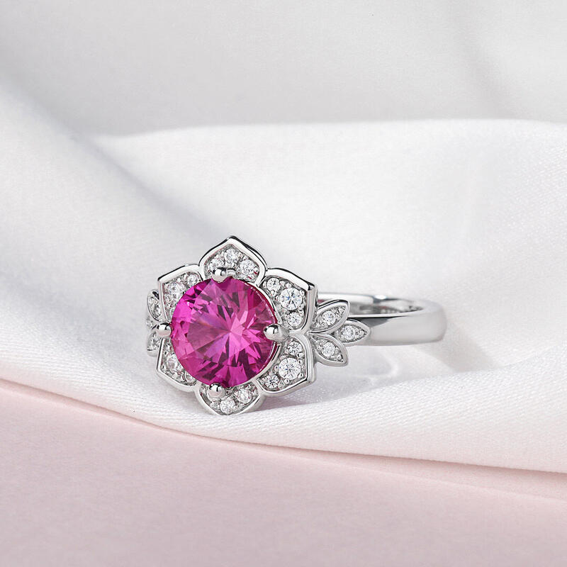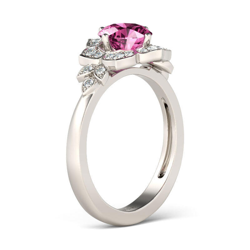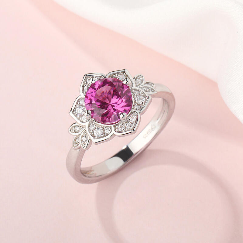 Dainty and delicate, this ring makes a little lovely gift for loved one or yourself. Crafted in sterling silver, the ring features a fancy pink round-cut center stone wrapped in a shimmering floral halo on a high polished shank. The leaf design on the shank makes the ring show a more elegant look. The shank is buffed to show a shiny look. Treat yourself or surprise her with this beautiful piece.