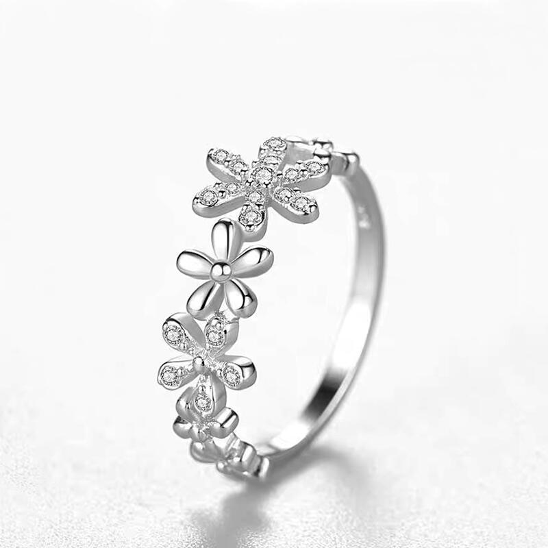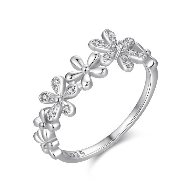 Flower is one of the most popular motifs in jewelry. It's often related with beauty, vitality and happiness, like your love. Made in sterling silver with brilliant white stones, this ring features six charming flowers.