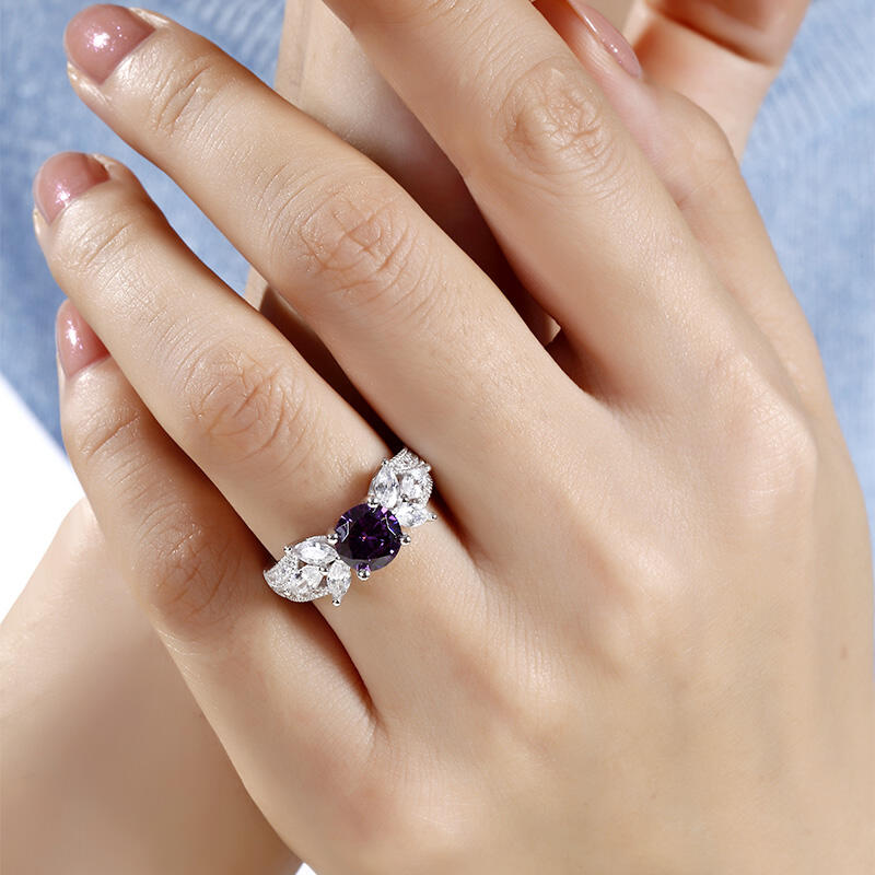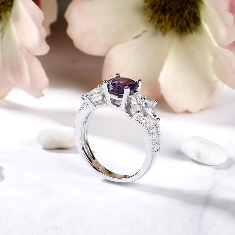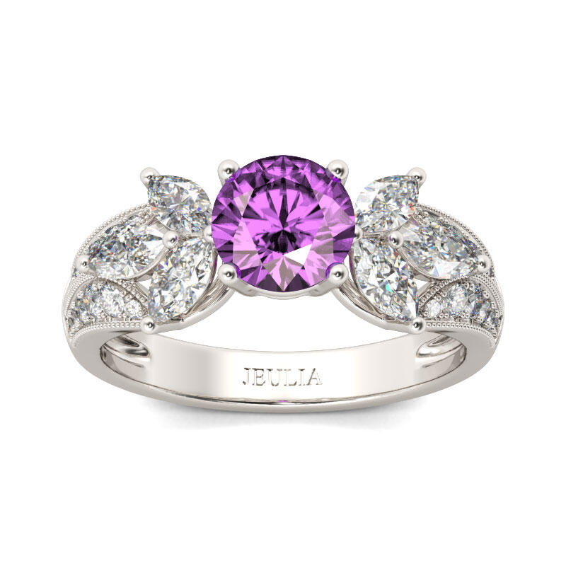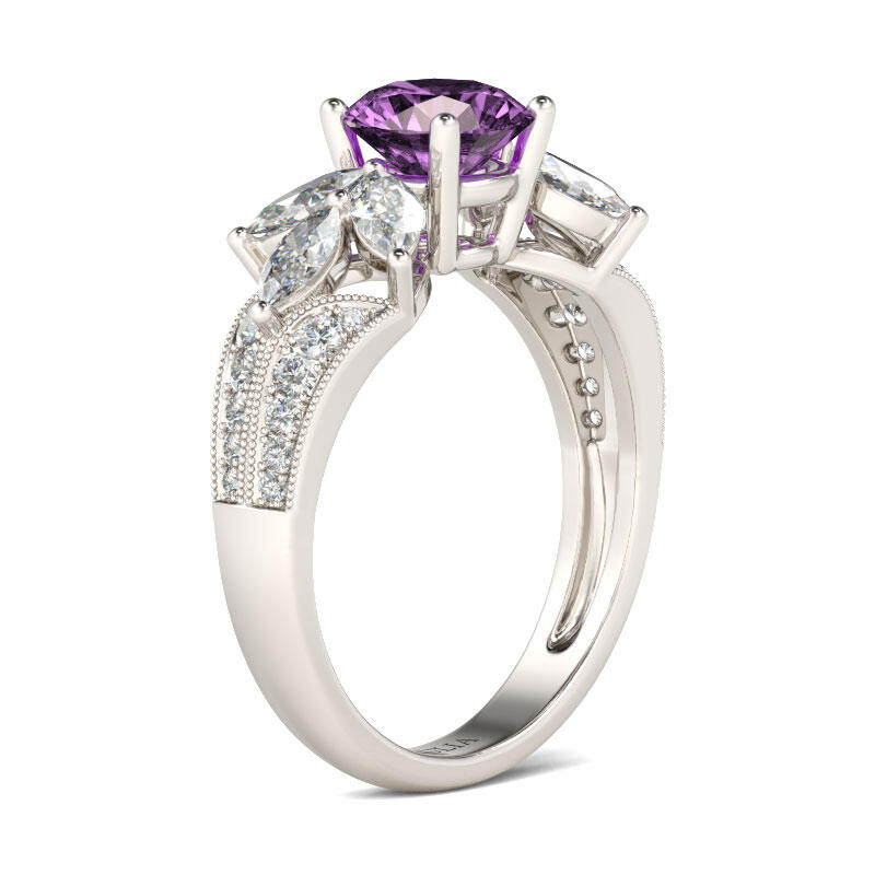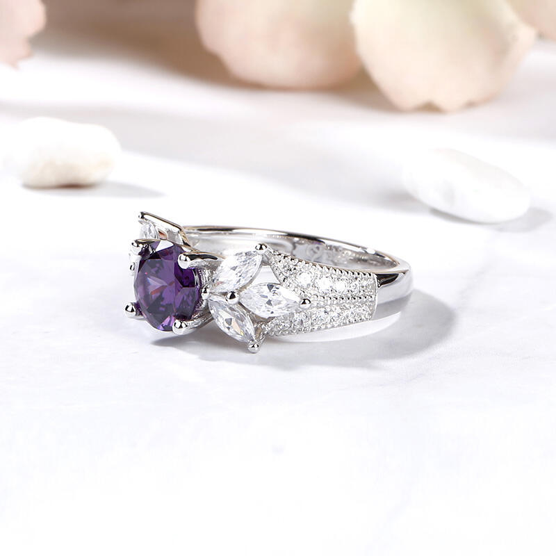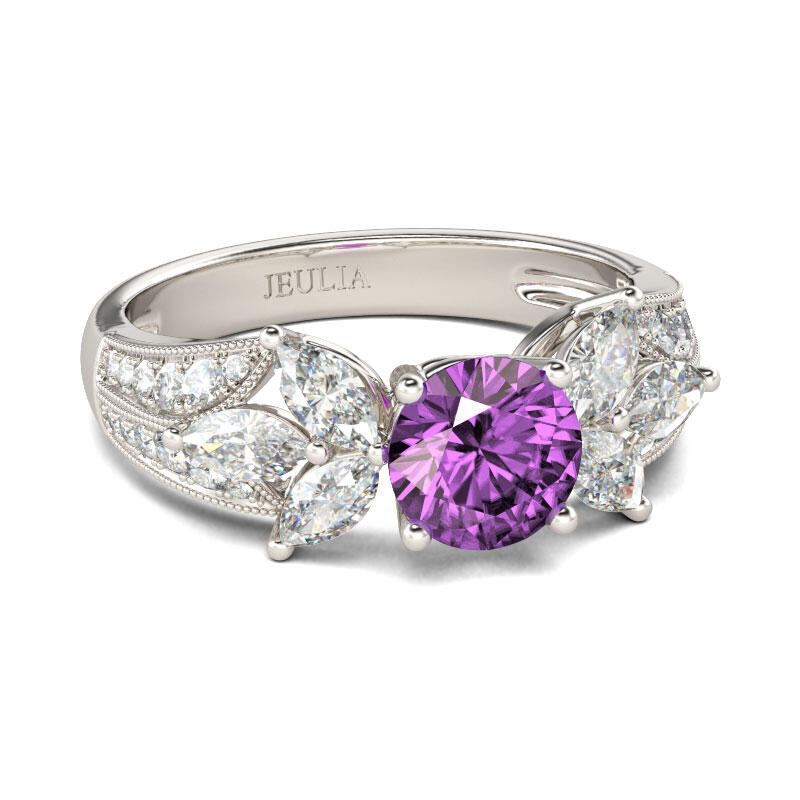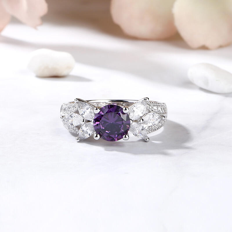 Glistening and glamorous, this ring will win your heart. This exquisite design features an amethyst purple round-cut center stone accented with two flowers on the left and right. The flowers shimmer with glistening marquise-cut stones. Milgrain detailing and small white stones adorn the shank to show an elegant and dazzling look. This ring is a splendid choice you are sure to adore.