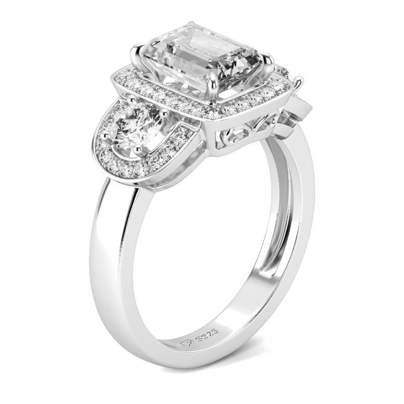 Proclaim your love sincerely, beautifully and proudly with this three stone ring. Exquisite in sterling silver, this fabulous day or evening ready look is centered with a beautiful emerald-cut stone flanked on either side by a smaller round white stone. Glistening with the stones and buffed to a brilliant luster, this exquisite ring speaks of a love that will last forever.