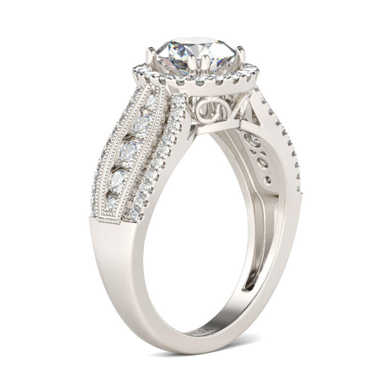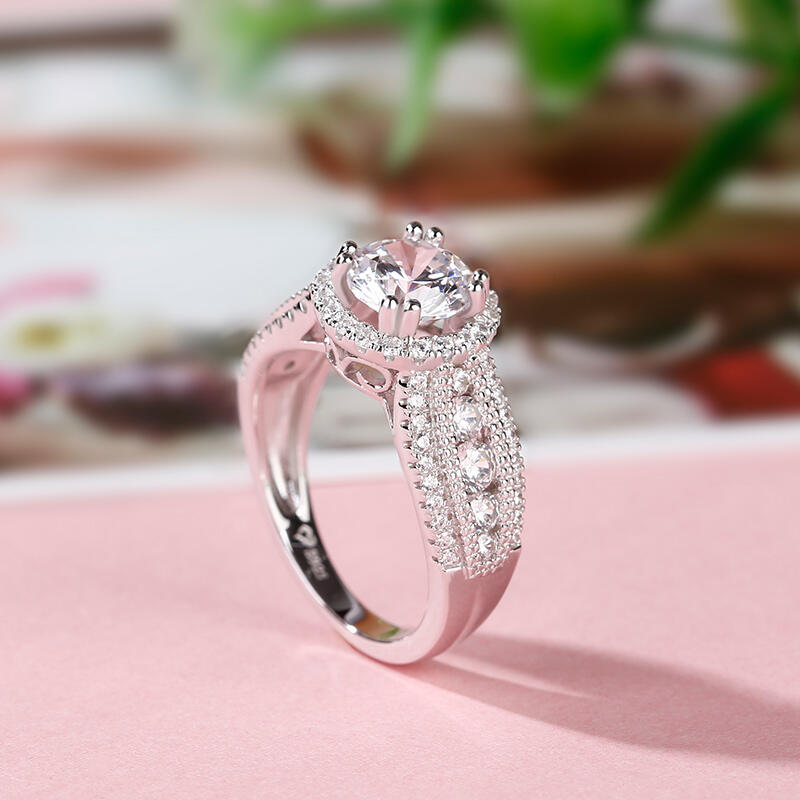 Love is in the air - and on her finger - with this splendid engagement ring. Crafted in sterling silver, this modern style features a sparkling round-cut center stone wrapped in a halo frame of round stones. Along the shank, three rows of stones lend more drama to the design. An elegant choice, this stunning ring shares your vision of the future.