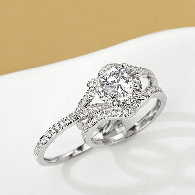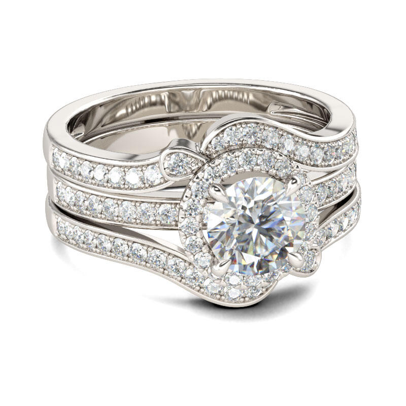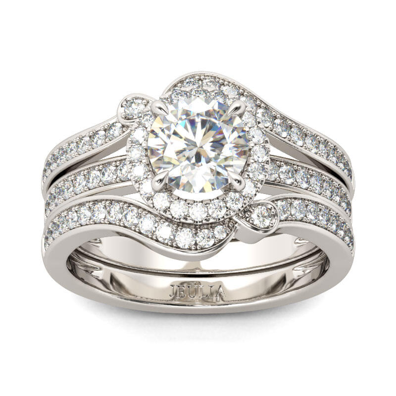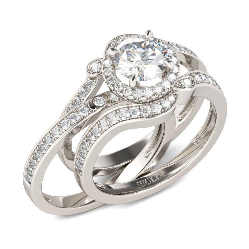 Unique and luxurious, this ring set will capture your heart at first sight. Crafted in sterling silver, this ring set features a round-cut center stone wrapped in a glistening halo on a wide split shank. Along the split shank, shimmering stones are set to add sparkle to it. The coordinating band can be inserted into the split shank of the ring to complement the design. This ring set is in interchangeable construction, which is an exclusive design of Jeulia. Take this ring set as a gift of love, and it won't disappoint you.
