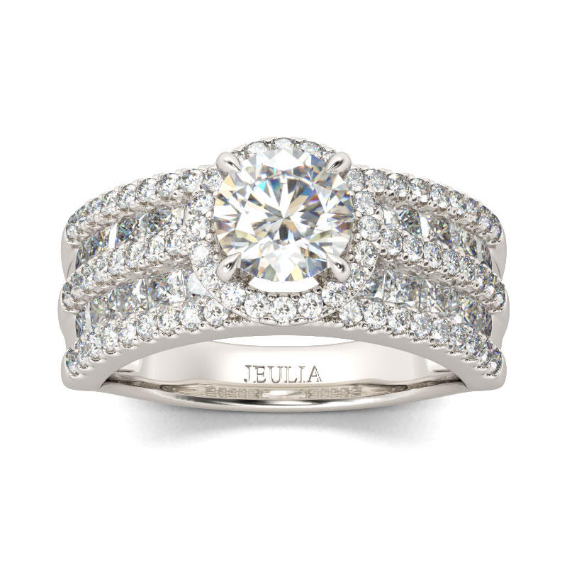 This classic halo ring features its two row design,which make it different from other rings. The ring is delicately set with round and princess cut stones,which makes it incomparably brilliant from front view.
