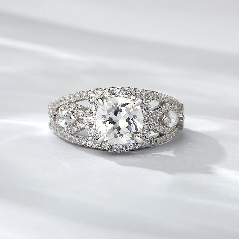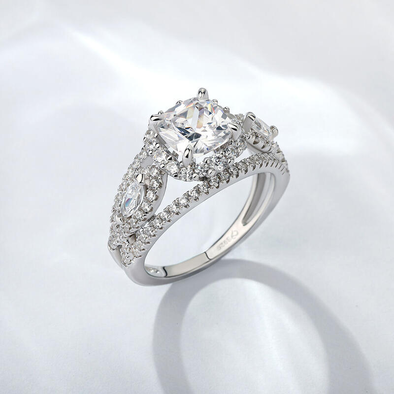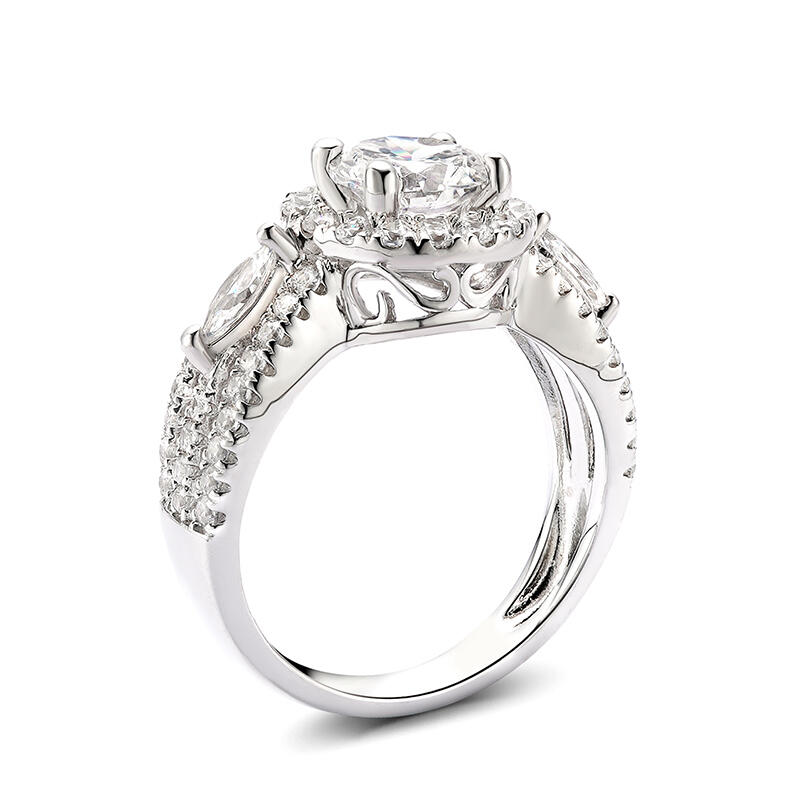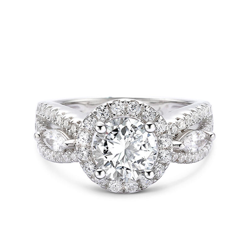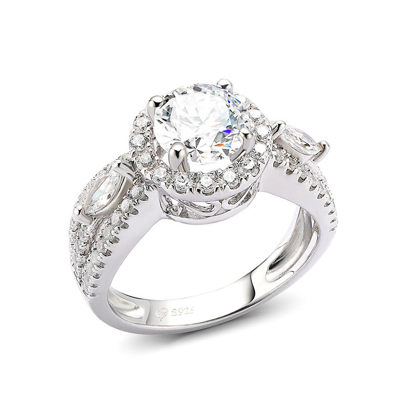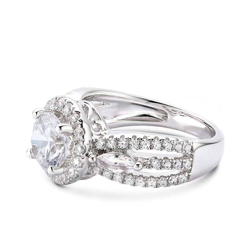 Your love for her is a beautiful and strong connection filled with memories and unforgettable moments. Ask her to be yours with the ring of her dreams. Crafted in sterling silver, this dazzling ring features a frame of round stones encircling a round center stone. Accompanied by a triple-split shank, this engagement ring is extraordinary. Buffed to a brilliant luster, she will forever appreciate the romantic elegance.