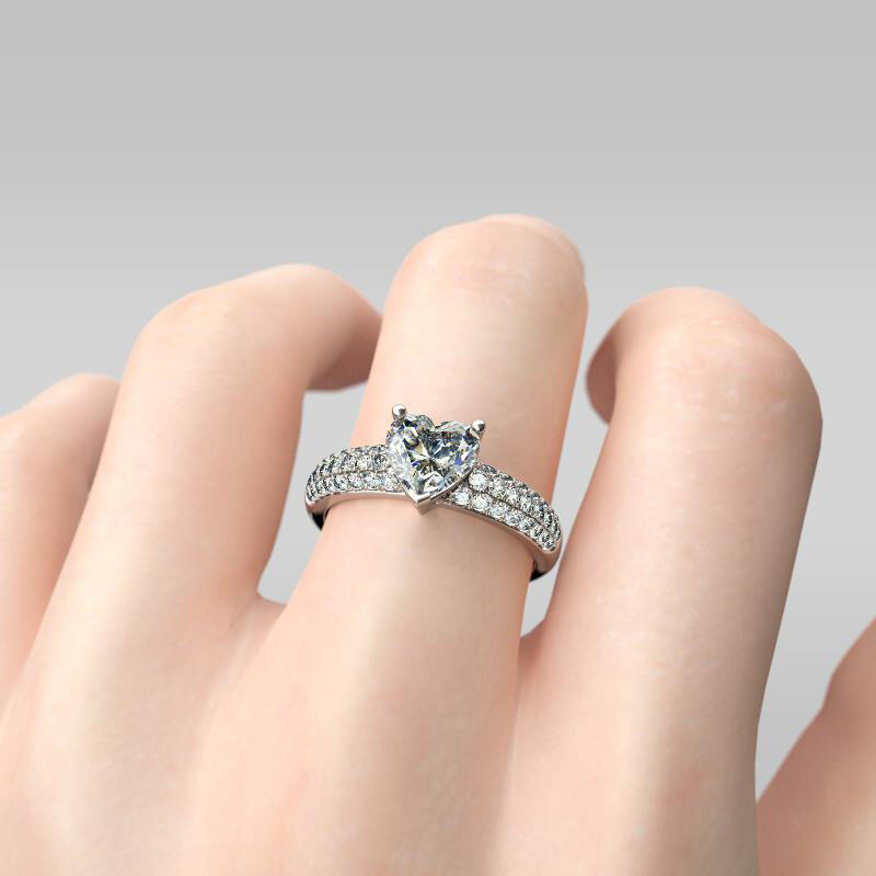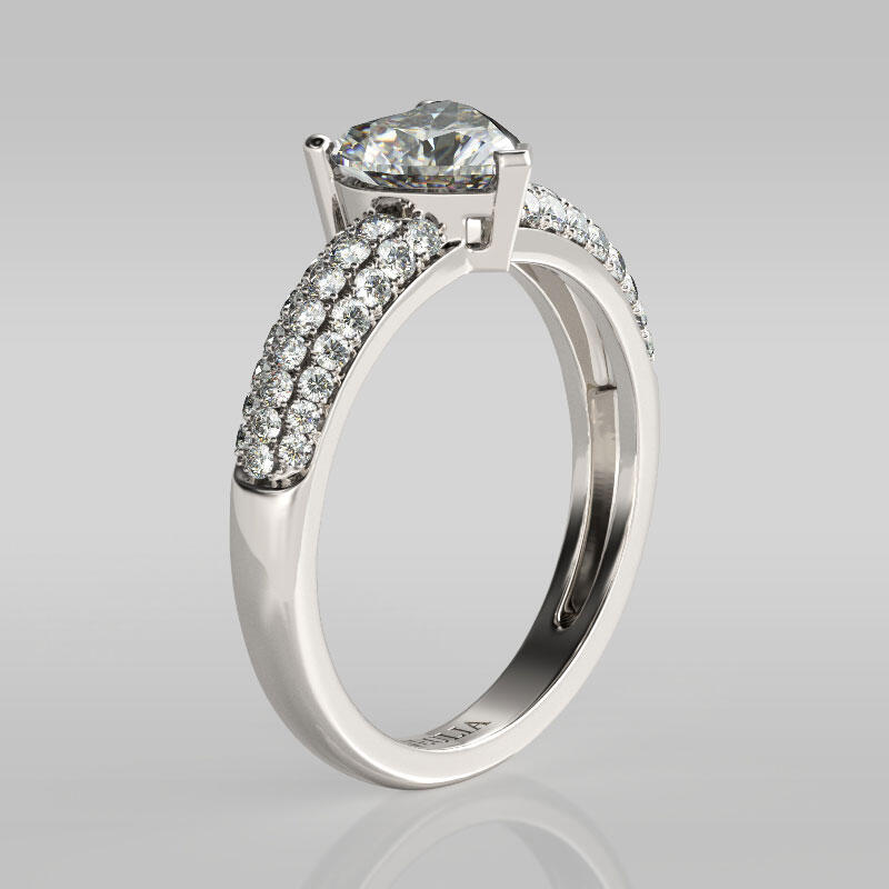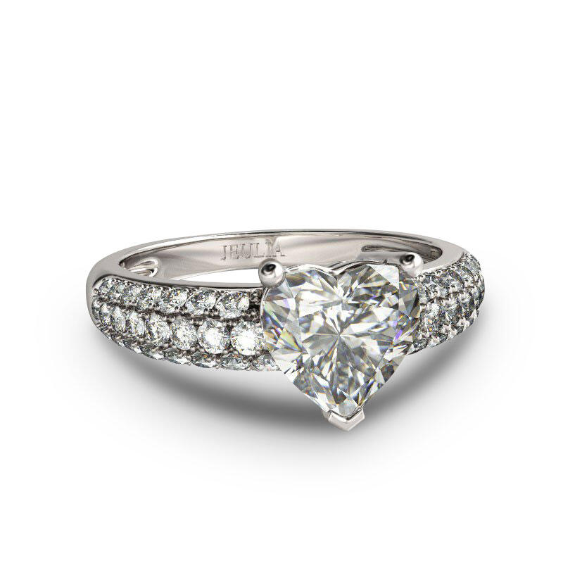 A brilliant celebration of your love, this sparkling engagement ring symbolizes your unforgettable moments. Crafted in sterling silver, the ring shimmers with a sparkling heart cut center stone. Three rows of shimmering round stones adorn the shank, completing this stunning design. Glamorous and classic, this exceptional ring will forever express your eternal love and undying commitment.