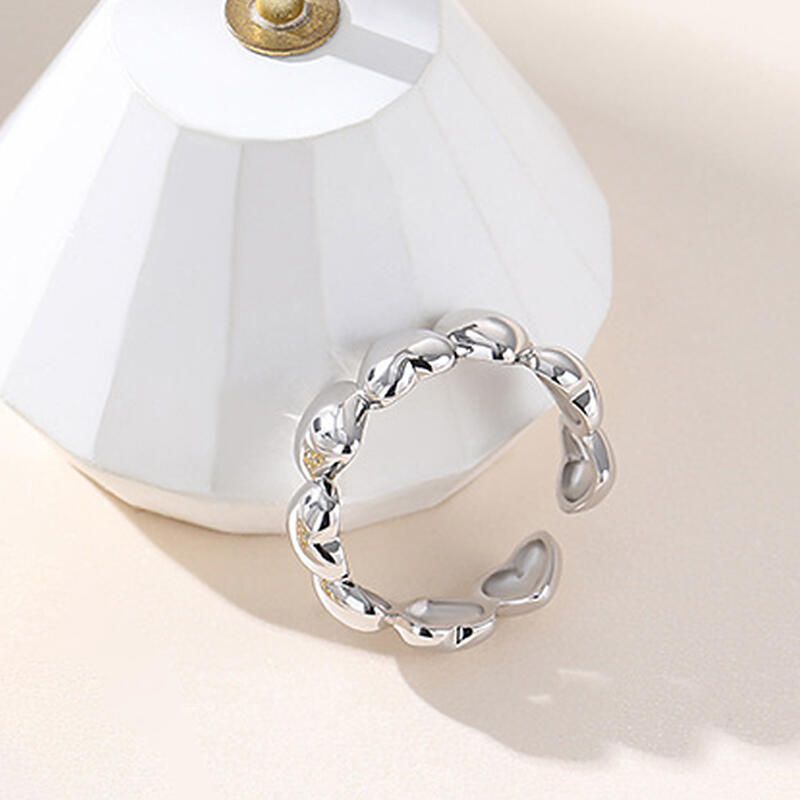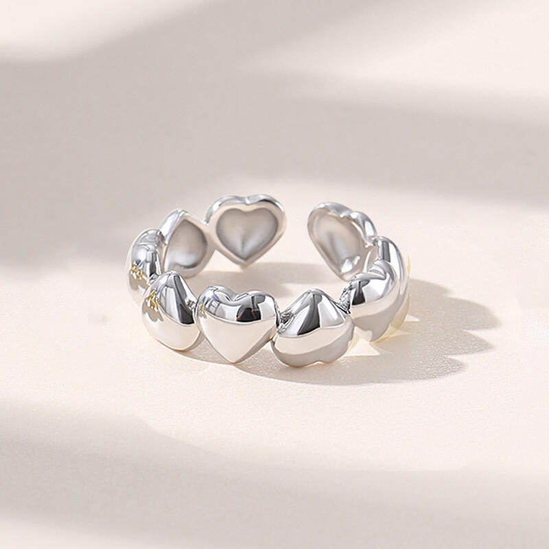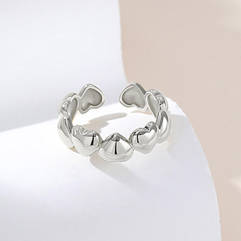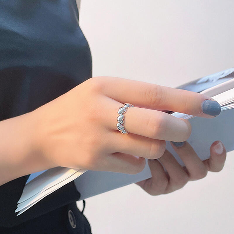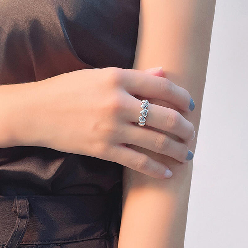 Heart is one of the most popular motifs in jewelry that often related with love. Crafted in sterling silver, this ring sculptures a series of heart shapes. This band is a beautiful reminder of your timeless romance.