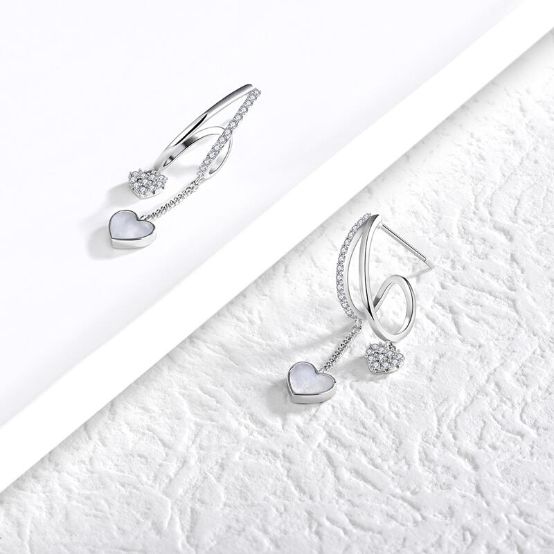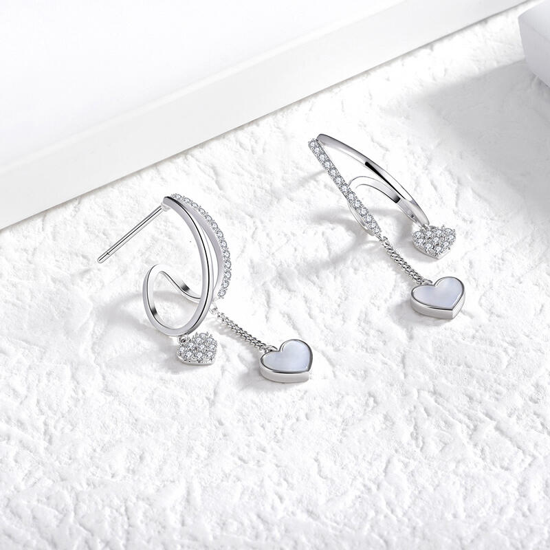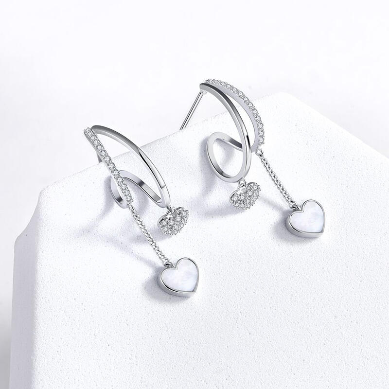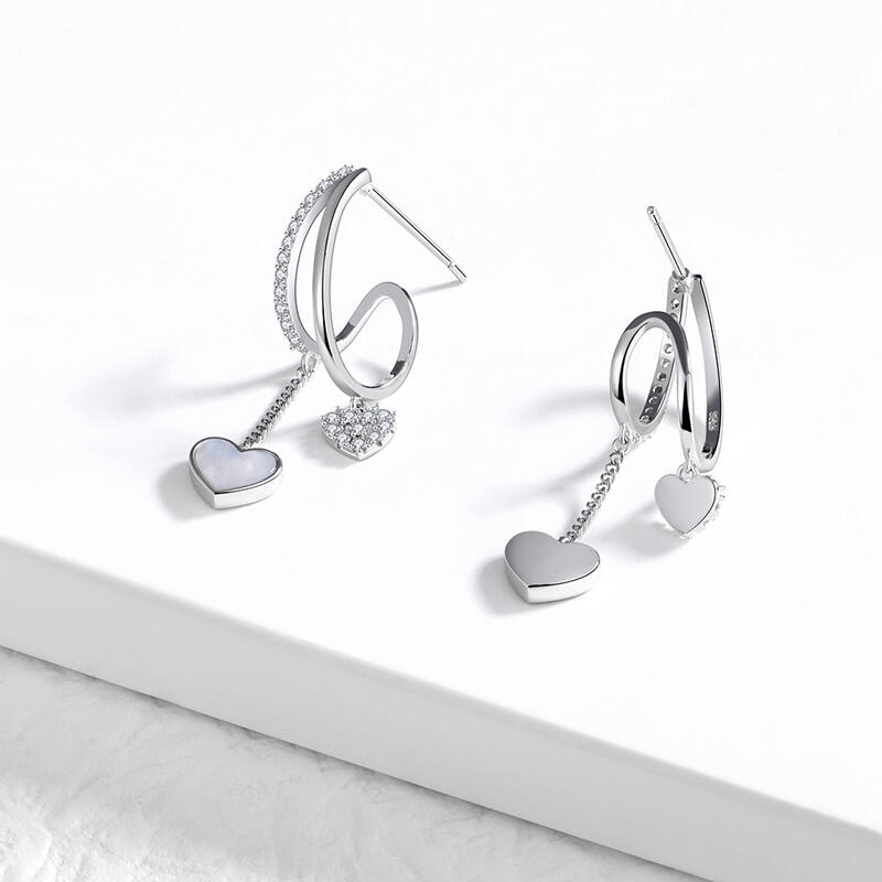 The enduring drop earrings performed in sterling silver are decorated with sophisticated heart-shaped mother-of-pearl and sparking stones set hanging down from the smaller heart. Displaying a glimmering festivity of love, these earrings are a tender and elegant present that will convey all warm sentiments to your beloved.