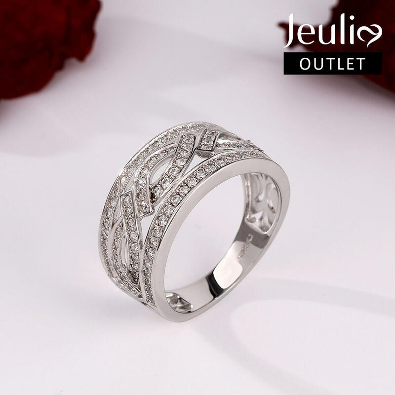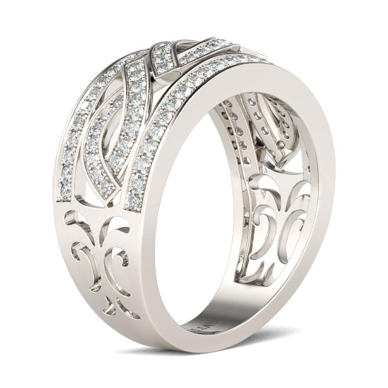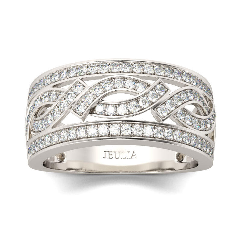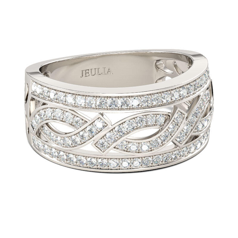 Dainty and delicate, this wedding band will capture your heart at first sight. Crafted in sterling silver, the band features the twisting ribbons on the shank. Shimmering stones adorn the shank to complement the design and make the band a sparkling piece. Delicate carvings on the shank add vintage aesthetic characteristics for the band. Never miss it!