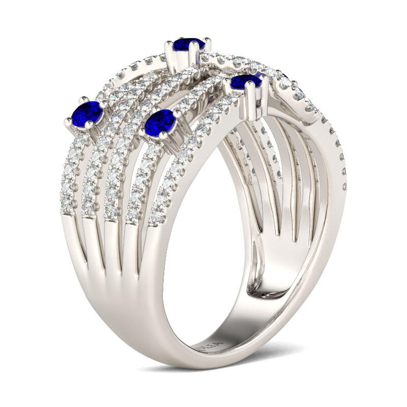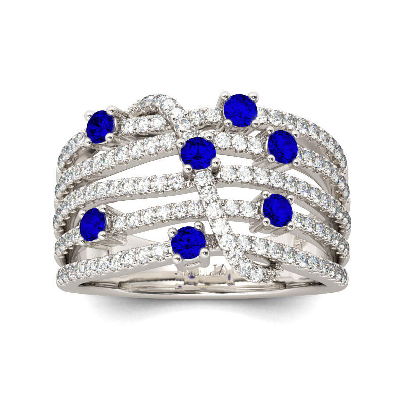 An extravagant and unusual look, like stars adorning the clear night sky, this exquisite ring is a dazzling anytime accessory. Shimmering blue stones scattered on multi-row shank, while white stones glisten on the interwined ribbons for a touch of sparkle. This stunning look is sure to bring her instant compliments.