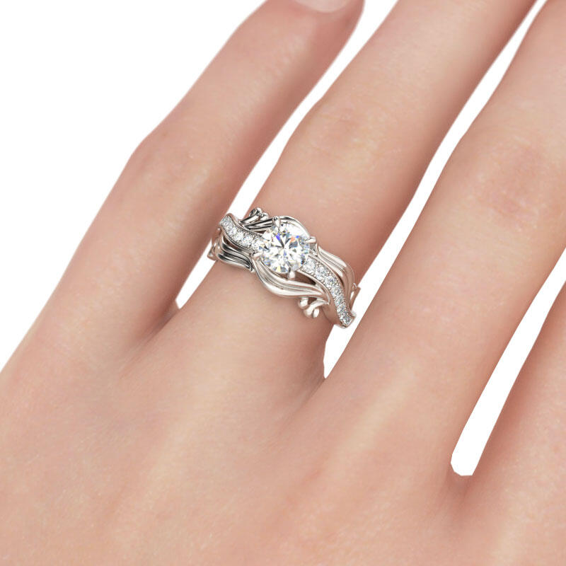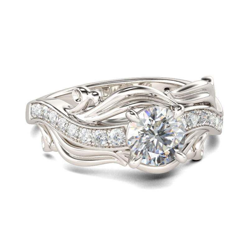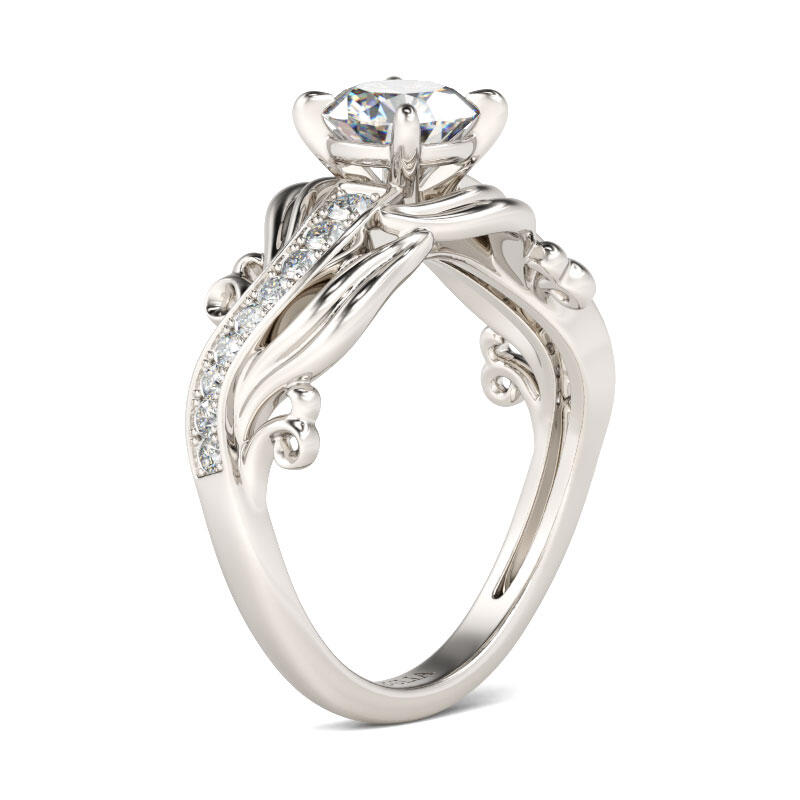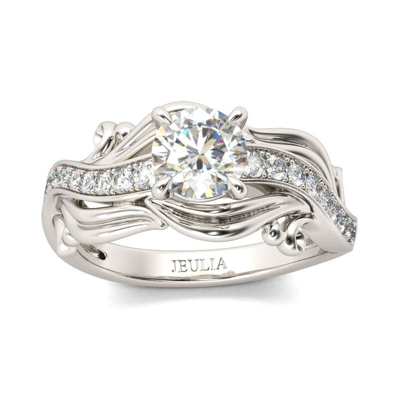 Unique and elegant, this ring will be an eye-catcher everywhere. Crafted in sterling silver, the ring features a round-cut center stone set on a wavelike shank. Along the shank, a line of shimmering round stones are set to add sparkle to the ring. Adorned with the unique leaf design, the ring will show an exquisite and feminine look on your finger. Treat yourself or surprise her with this stunning piece this holiday.