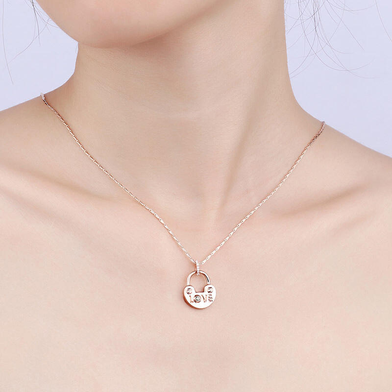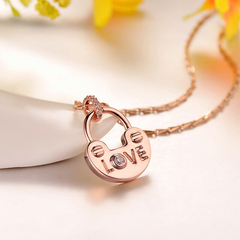 Lock your love with this cute rose gold necklace. Fashioned in classic sterling silver, the pendant is embellished with a shining stone as the letter "o" in "love". Give her the key to your heart with this beautiful lock-inspired necklace.