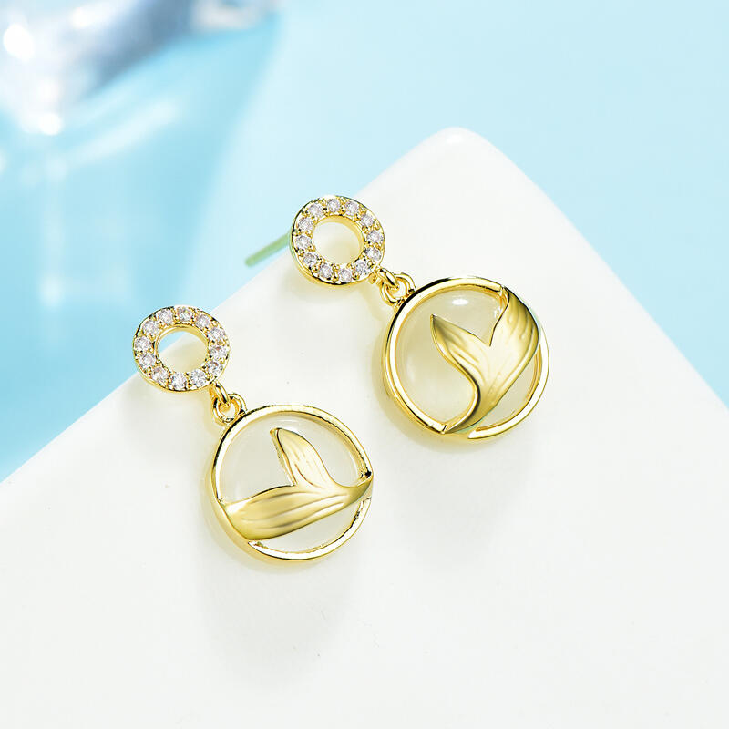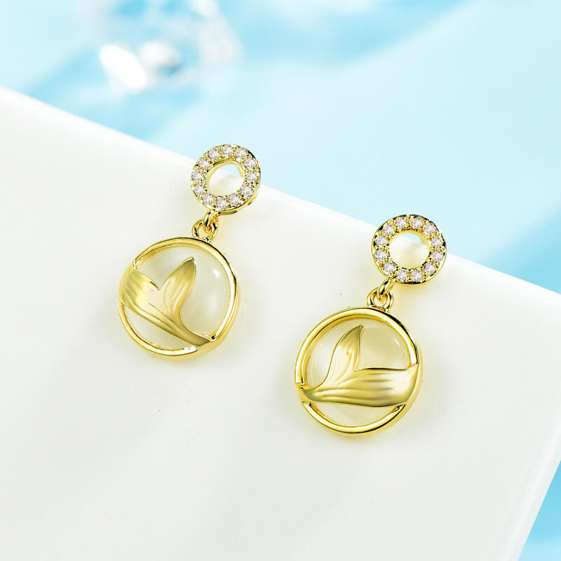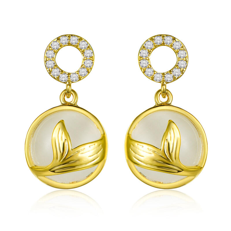 Capture the mystical mermaid vibe with these fun drop earrings. These mermaid tail drop earrings would be a truly special addition to any collection. The round stones sparkle in the light and the golden mermaid tail has an exquisitely detailed design. These earrings are absolutely unique and not to be missed.