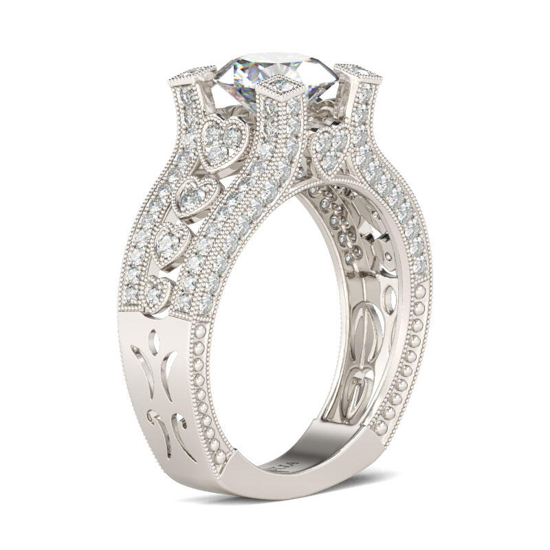 A vintage-inspired token of your affection, this romantic engagement ring is an elegant open to your love story. Crafted in 925 sterling silver, this sophisticated style showcases a shimmering 8mm center stone set on a high mount and in a intricate heart design shank. The split shank glistens with three side paved round stone and milgrain detailing. This beautiful engagement ring sets the stage for your happily ever after.