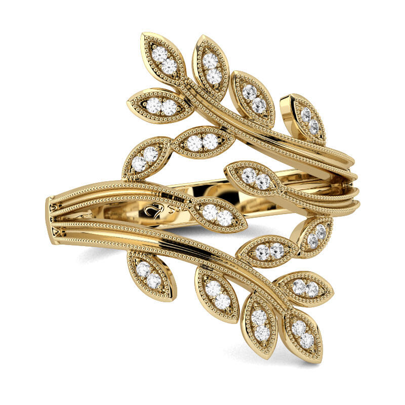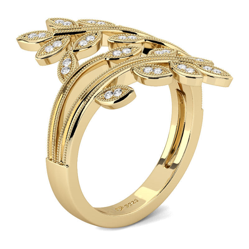 A garland of shimmer for her finger, this olive leaf design ring adds dimension to her look. Crafted in sterling silver, this beguiling design features marquise-shaped leaves lined with intricate veins detailing in a lovely laurel. Perfectly placed petite stones add just the right touch of sparkle.